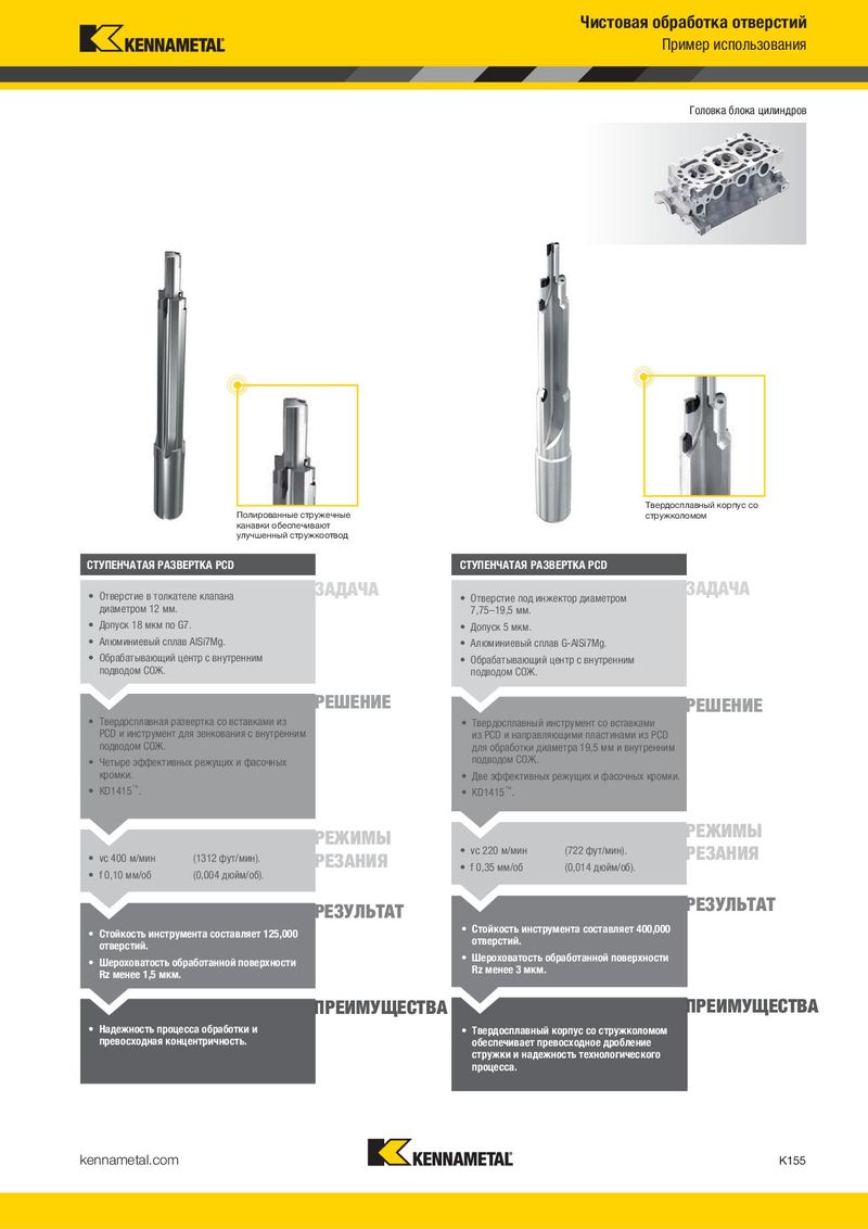 Чистовая обработка отверстий Пример использования Головка блока цилиндров Твердосплавный корпус со Полированные стружечные стружколомом канавки обеспечивают улучшенный стружкоотвод СТУПЕНЧАТАЯ РАЗВЕРТКА PCD СТУПЕНЧАТАЯ РАЗВЕРТКА PCD • Отверстие в толкателе клапана ЗАДАЧА • Отверстие под инжектор диаметром ЗАДАЧА диаметром 12 мм. 7,75–19,5 мм. • Допуск 18 мкм по G7. • Допуск 5 мкм. • Алюминиевый сплав AlSi7Mg. • Алюминиевый сплав G-AlSi7Mg. • Обрабатывающий центр с внутренним • Обрабатывающий центр с внутренним подводом СОЖ. подводом СОЖ. РЕШЕНИЕ РЕШЕНИЕ • Твердосплавная развертка со вставками из • Твердосплавный инструмент со вставками PCD и инструмент для зенкования с внутренним из PCD и направляющими пластинами из PCD подводом СОЖ. для обработки диаметра 19,5 мм и внутренним • Четыре эффективных режущих и фасочных подводом СОЖ. кромки. • Две эффективных режущих и фасочных кромки. • KD1415™. • KD1415™. РЕЖИМЫ РЕЖИМЫ • vc 400 м/мин (1312 фут/мин). РЕЗАНИЯ • vc 220 м/мин (722 фут/мин). РЕЗАНИЯ • f 0,10 мм/об (0,004 дюйм/об). • f 0,35 мм/об (0,014 дюйм/об). РЕЗУЛЬТАТ РЕЗУЛЬТАТ • Стойкость инструмента составляет 125,000 • Стойкость инструмента составляет 400,000 отверстий. отверстий. • Шероховатость обработанной поверхности • Шероховатость обработанной поверхности Rz менее 1,5 мкм. Rz менее 3 мкм. ПРЕИМУЩЕСТВА ПРЕИМУЩЕСТВА • Надежность процесса обработки и • Твердосплавный корпус со стружколомом превосходная концентричность. обеспечивает превосходное дробление стружки и надежность технологического процесса. kennametal.com K155