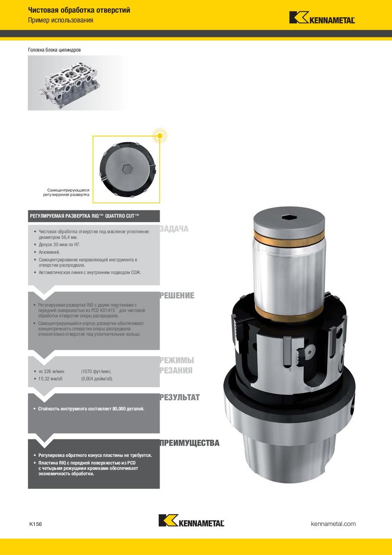Чистовая обработка отверстий Пример использования Головка блока цилиндров Самоцентрирующаяся регулируемая развертка РЕГУЛИРУЕМАЯ РАЗВЕРТКА RIQ™ QUATTRO CUT™ • Чистовая обработка отверстия под масляное уплотнение ЗАДАЧА диаметром 56,4 мм. • Допуск 30 мкм по H7. • Алюминий. • Самоцентрирование направляющей инструмента в отверстии распредвала. • Автоматическая линия с внутренним подводом СОЖ. РЕШЕНИЕ • Регулируемая развертка RIQ с двумя пластинами с передней поверхностью из PCD KD1415™ для чистовой обработки отверстия опоры распредвала. • Самоцентрирующийся корпус развертки обеспечивает концентричность отверстия опоры распредвала относительно отверстия под уплотнительное кольцо. РЕЖИМЫ • vc 326 м/мин (1070 фут/мин). РЕЗАНИЯ • f 0,32 мм/об (0,004 дюйм/об). РЕЗУЛЬТАТ • Стойкость инструмента составляет 80,000 деталей. ПРЕИМУЩЕСТВА • Регулировка обратного конуса пластины не требуется. • Пластина RIQ с передней поверхностью из PCD с четырьмя режущими кромками обеспечивает экономичность обработки. K156 kennametal.com