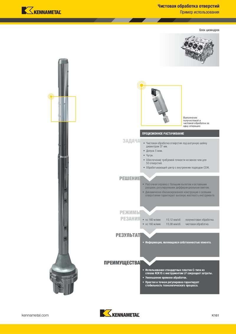 Чистовая обработка отверстий Пример использования Блок цилиндров Выполнение получистовой и чистовой обработки за одну операцию ПРЕЦИЗИОННОЕ РАСТАЧИВАНИЕ ЗАДАЧА • Чистовая обработка отверстия под шатунную шейку диаметром 37 мм. • Допуск 5 мкм. • Чугун. • Обеспечение требуемой точности не менее чем для 50 отверстий. • Обрабатывающий центр с внутренним подводом СОЖ. РЕШЕНИЕ • Расточная оправка с большим вылетом и вставными резцами, регулируемыми дифференциальным винтом. • Динамически сбалансированная конструкция с осевыми отверстиями гарантирует высокую жесткость инструмента. РЕЖИМЫ РЕЗАНИЯ • vc 160 м/мин f 0,12 мм/об получистовая обработка. • vc 160 м/мин f 0,08 мм/об чистовая обработка. РЕЗУЛЬТАТ • Информация, являющаяся собственностью клиента. ПРЕИМУЩЕСТВА • Использование стандартных пластин C-типа из сплава KCK15 с инструментом LF сокращает затраты. • Уменьшение времени обработки. • Простая и точная регулировка гарантирует стабильность технологического процесса. kennametal.com K161