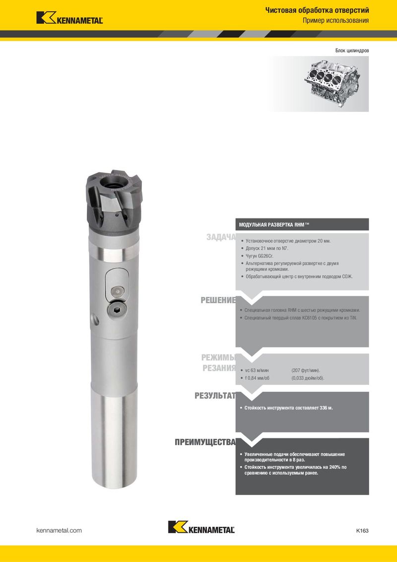 Чистовая обработка отверстий Пример использования Блок цилиндров МОДУЛЬНАЯ РАЗВЕРТКА RHM™ ЗАДАЧА • Установочное отверстие диаметром 20 мм. • Допуск 21 мкм по N7. • Чугун GG26Cr. • Альтернатива регулируемой развертке с двумя режущими кромками. • Обрабатывающий центр с внутренним подводом СОЖ. РЕШЕНИЕ • Специальная головка RHM с шестью режущими кромками. • Специальный твердый сплав KC6105 с покрытием из TiN. РЕЖИМЫ РЕЗАНИЯ • vc 63 м/мин (207 фут/мин). • f 0,84 мм/об (0,033 дюйм/об). РЕЗУЛЬТАТ • Стойкость инструмента составляет 336 м. ПРЕИМУЩЕСТВА • Увеличенные подачи обеспечивают повышение производительности в 8 раз. • Стойкость инструмента увеличилась на 240% по сравнению с используемым ранее. kennametal.com K163