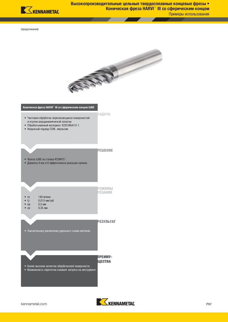 Высокопроизводительные цельные твердосплавные концевые фрезы • Коническая фреза HARVI™ III со сферическим концом Примеры использования (продолжение) Коническая фреза HARVI™ III со сферическим концом UJBE ЗАДАЧА • Чистовая обработка пересекающихся поверхностей и втулки аэродинамической лопатки. • Обрабатываемый материал: X22CrMoV12-1. • Наружный подвод СОЖ, эмульсия. РЕШЕНИЕ • Фреза UJBE из сплава KCSM15™. • Диаметр 4 мм и 8 эффективных режущих кромок. РЕЖИМЫ РЕЗАНИЯ • vc 140 м/мин • fz 0,015 мм/зуб • ap 0,5 мм • ae 0,35 мм РЕЗУЛЬТАТ • Значительное увеличение удельного съема металла. ПРЕИМУ- ЩЕСТВА • Более высокое качество обработанной поверхности. • Возможность переточки снижает затраты на инструмент. kennametal.com P67
