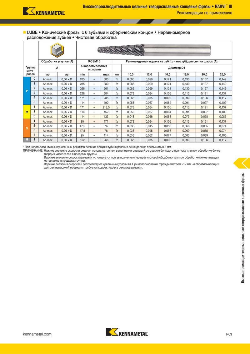 Высокопроизводительные цельные твердосплавные концевые фрезы • HARVI™ III Рекомендации по применению UJBE • Конические фрезы с 6 зубьями и сферическим концом • Неравномерное расположение зубьев • Чистовая обработка Обработка уступов (A) KCSM15 Рекомендуемая подача на зуб (fz = мм/зуб) для снятия фасок (A). Группа A Скорость резания Диаметр D1 мате- vc, м/мин риала ap ae min max мм 10,0 12,0 16,0 18,0 20,0 25,0 0 Ap max 0,06 x D 285 – 380 fz 0,086 0,099 0,121 0,130 0,137 0,149 1 Ap max 0,06 x D 285 – 380 fz 0,086 0,099 0,121 0,130 0,137 0,149 2 Ap max 0,06 x D 266 – 361 fz 0,086 0,099 0,121 0,130 0,137 0,149 P 3 Ap max 0,06 x D 228 – 304 fz 0,073 0,084 0,105 0,113 0,121 0,137 4 Ap max 0,06 x D 171 – 285 fz 0,065 0,075 0,092 0,099 0,106 0,117 5 Ap max 0,06 x D 114 – 190 fz 0,058 0,067 0,084 0,091 0,097 0,109 1 Ap max 0,06 x D 171 – 218,5 fz 0,073 0,084 0,105 0,113 0,121 0,137 M 2 Ap max 0,06 x D 114 – 152 fz 0,058 0,067 0,084 0,091 0,097 0,109 3 Ap max 0,06 x D 114 – 133 fz 0,048 0,056 0,068 0,073 0,078 0,085 1 Ap max 0,06 x D 95 – 171 fz 0,073 0,084 0,105 0,113 0,121 0,137 2 Ap max 0,06 x D 47,5 – 76 fz 0,038 0,045 0,056 0,060 0,065 0,074 S 3 Ap max 0,06 x D 47,5 – 76 fz 0,038 0,045 0,056 0,060 0,065 0,074 4 Ap max 0,06 x D 95 – 114 fz 0,053 0,062 0,077 0,083 0,089 0,100 H 1 Ap max 0,06 x D 152 – 266 fz 0,065 0,075 0,092 0,099 0,106 0,117 * При использовании вышеуказанных режимов резания общая глубина резания ae не должна превышать 0,8 мм. ПРИМЕЧАНИЕ. Нижнее значение скорости резания используется при выполнении операций со съемом большого припуска или при обработке более твердых материалов в пределах группы. Верхнее значение скорости резания используется при выполнении операций чистовой обработки или при обработке менее твердых материалов в пределах группы. Верхние значения скоростей соответствуют идеальным условиям. При использовании фрез диаметром >12 мм на обрабатывающих центрах невысокой мощности требуется корректировка режимов резания. Высокопроизводительные цельные твердосплавные концевые фрезы kennametal.com P69