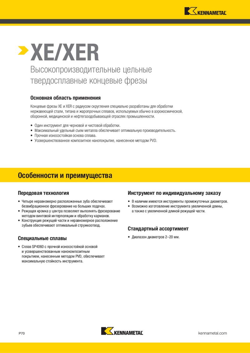 XE/XER Высокопроизводительные цельные твердосплавные концевые фрезы Основная область применения Концевые фрезы XE и XER с радиусом скругления специально разработаны для обработки нержавеющей стали, титана и жаропрочных сплавов, используемых обычно в аэрокосмической, оборонной, медицинской и нефтегазодобывающей отраслях промышленности. • Один инструмент для черновой и чистовой обработки. • Максимальный удельный съем металла обеспечивает оптимальную производительность. • Прочная износостойкая основа сплава. • Усовершенствованное композитное нанопокрытие, нанесенное методом PVD. Особенности и преимущества Передовая технология Инструмент по индивидуальному заказу • Четыре неравномерно расположенных зуба обеспечивают • В наличии имеются инструменты промежуточных диаметров. безвибрационное фрезерование на больших подачах. • Возможно изготовление инструмента увеличенной длины, • Режущая кромка у центра позволяет выполнять фрезерование а также с увеличенной длиной режущей части. методом винтовой интерполяции и обработку карманов. • Конструкция режущей части и неравномерное расположение зубьев обеспечивают оптимальный стружкоотвод. Стандартный ассортимент Специальные сплавы • Диапазон диаметров 2–20 мм. • Сплав SP4060 с прочной износостойкой основой и усовершенствованным нанокомпозитным покрытием, нанесенным методом PVD, обеспечивает максимальную стойкость инструмента. P70 kennametal.com