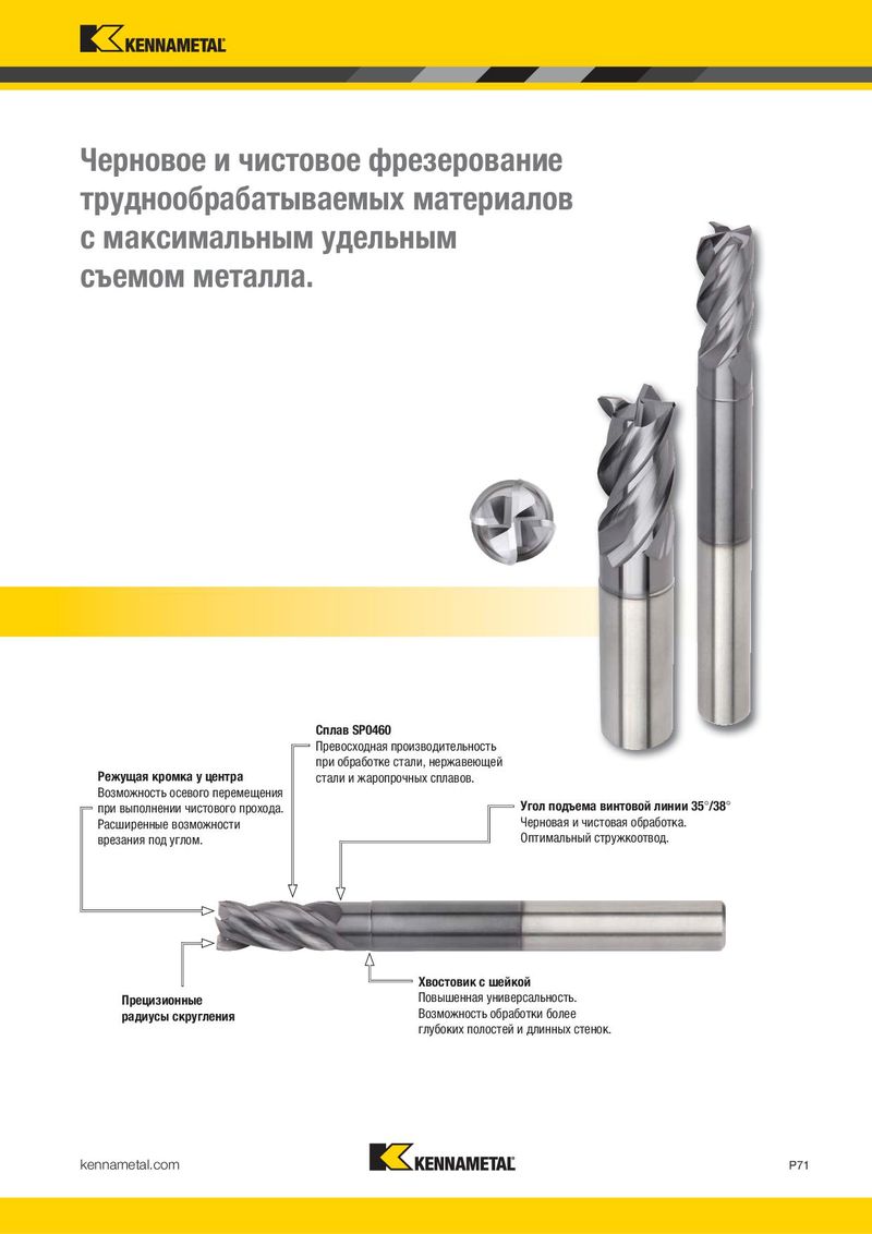 Черновое и чистовое фрезерование труднообрабатываемых материалов с максимальным удельным съемом металла. Сплав SP0460 Превосходная производительность при обработке стали, нержавеющей Режущая кромка у центра стали и жаропрочных сплавов. Возможность осевого перемещения при выполнении чистового прохода. Угол подъема винтовой линии 35°/38° Расширенные возможности Черновая и чистовая обработка. врезания под углом. Оптимальный стружкоотвод. Хвостовик с шейкой Прецизионные Повышенная универсальность. радиусы скругления Возможность обработки более глубоких полостей и длинных стенок. kennametal.com P71
