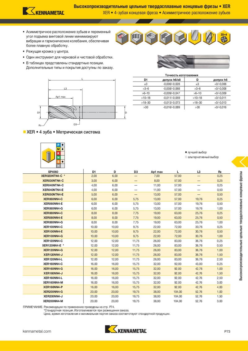 Высокопроизводительные цельные твердосплавные концевые фрезы • XER XER • 4-зубая концевая фреза • Асимметричное расположение зубьев • Асимметричное расположение зубьев и переменный угол подъема винтовой линии минимизируют вибрации и гармонические колебания, обеспечивая более плавную обработку. • Режущая кромка у центра. • Один инструмент для черновой и чистовой обработки. • В таблицах представлены стандартные позиции. Дополнительные типы и покрытия доступны по заказу. Tочность изготовления L D1 допуск h6/e8 D допуск h6 )3 -0,006/-0,028 )3 +0/-0,006 L3 >3–6 -0,008/-0,068 >3–6 +0/-0,008 >6–10 -0,009/-0,047 >6–10 +0/-0,009 Ap1 max >10–18 -0,011/-0,059 >10–18 +0/-0,011 >18–30 -0,013/-0,073 >18–30 +0/-0,013 >30 -0,016/-0,089 >30 +0/-0,016 D1 D Rε D3 XER • 4 зуба • Метрическая система ⅷ лучший выбор ࠗ альтернативный выбор SSPP44006600 D1 D D3 Ap1 max L L3 R¡ Высокопроизводительные цельные твердосплавные концевые фрезы XER020NTN4-C * 2,00 6,00 — 7,00 57,00 — 0,25 XER030NTN4-C 3,00 6,00 — 8,00 57,00 — 0,25 XER040NTN4-C 4,00 6,00 — 11,00 57,00 — 0,25 XER040NTN4-E 4,00 6,00 — 11,00 57,00 — 0,50 XER050NTN4-E 5,00 6,00 — 13,00 57,00 — 0,50 XER060NN4-C 6,00 6,00 5,75 13,00 57,00 19,76 0,25 XER060NN4-E 6,00 6,00 5,75 13,00 57,00 19,76 0,50 XER060NN4-G 6,00 6,00 5,75 13,00 57,00 19,76 1,00 XER080NN4-C 8,00 8,00 7,75 19,00 63,00 25,76 0,25 XER080NN4-E 8,00 8,00 7,75 19,00 63,00 25,76 0,50 XER080NN4-G 8,00 8,00 7,75 19,00 63,00 25,76 1,00 XER100NN4-C 10,00 10,00 9,75 22,00 72,00 30,76 0,25 XER100NN4-E 10,00 10,00 9,75 22,00 72,00 30,76 0,50 XER100NN4-G 10,00 10,00 9,75 22,00 72,00 30,76 1,00 XER120NN4-C 12,00 12,00 11,75 26,00 83,00 36,76 0,25 XER120NN4-E * 12,00 12,00 11,75 26,00 83,00 36,76 0,50 XER120NN4-G 12,00 12,00 11,75 26,00 83,00 36,76 1,00 XER120NN4-J 12,00 12,00 11,75 26,00 83,00 36,76 1,50 XER120NN4-L 12,00 12,00 11,75 26,00 83,00 36,76 2,50 XER160NN4-C 16,00 16,00 15,75 32,00 92,00 43,00 0,25 XER160NN4-G 16,00 16,00 15,75 32,00 92,00 42,76 1,00 XER160NN4-J 16,00 16,00 15,75 32,00 92,00 42,76 1,50 XER160NN4-L 16,00 16,00 15,75 32,00 92,00 42,76 2,50 XER160NN4-M 16,00 16,00 15,75 32,00 92,00 42,76 3,00 XER160NN4-P 16,00 16,00 15,75 32,00 92,00 42,76 4,00 XER200NN4-G 20,00 20,00 19,75 38,00 104,00 52,76 1,00 XER200NN4-J 20,00 20,00 19,75 38,00 104,00 52,76 1,50 XER200NN4-M 20,00 20,00 19,75 38,00 104,00 52,76 3,00 ПРИМЕЧАНИЕ. Рекомендации по применению приведены на стр. P74. *Стандартная позиция. Изготавливается при размещении заказа. Цена, время изготовления и минимальная партия заказа соответствуют стандартной продукции. kennametal.com P73