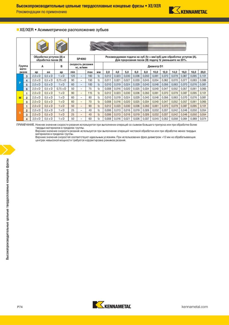 Высокопроизводительные цельные твердосплавные концевые фрезы • XE/XER Рекомендации по применению XE/XER • Асимметричное расположение зубьев Обработка уступов (A) и SP4060 Рекомендуемая подача на зуб (fz = мм/зуб) для обработки уступов (A). обработка пазов (B) Для прорезания пазов (B) подачу fz уменьшите на 20%. Группа A B скорость резания Диаметр D1 мате- vc, м/мин риала ap ae ap min max мм 2,0 4,0 5,0 6,0 8,0 10,0 12,0 14,0 16,0 18,0 20,0 3 2,0 x D 0,5 x D 1xD 120 – 160 fz 0,012 0,023 0,030 0,036 0,050 0,061 0,070 0,079 0,087 0,095 0,101 4 2,0 x D 0,5 x D 0,75 x D 90 – 150 fz 0,011 0,021 0,027 0,033 0,045 0,054 0,062 0,070 0,077 0,083 0,088 P 5 2,0 x D 0,5 x D 1xD 60 – 100 fz 0,010 0,019 0,024 0,029 0,040 0,048 0,056 0,063 0,070 0,076 0,081 6 2,0 x D 0,5 x D 0,75 x D 50 – 75 fz 0,008 0,016 0,020 0,025 0,034 0,040 0,047 0,052 0,057 0,061 0,065 1 2,0 x D 0,5 x D 1xD 90 – 115 fz 0,012 0,023 0,030 0,036 0,050 0,061 0,070 0,079 0,087 0,095 0,101 M 2 2,0 x D 0,5 x D 1xD 60 – 80 fz 0,010 0,019 0,024 0,029 0,040 0,048 0,056 0,063 0,070 0,076 0,081 3 2,0 x D 0,5 x D 1xD 60 – 70 fz 0,008 0,016 0,020 0,025 0,034 0,040 0,047 0,052 0,057 0,061 0,065 1 2,0 x D 0,5 x D 1xD 50 – 90 fz 0,012 0,023 0,030 0,036 0,050 0,061 0,070 0,079 0,087 0,095 0,101 2 2,0 x D 0,5 x D 1xD 25 – 40 fz 0,006 0,013 0,016 0,019 0,026 0,032 0,037 0,042 0,046 0,050 0,054 S 3 2,0 x D 0,5 x D 1xD 25 – 40 fz 0,006 0,013 0,016 0,019 0,026 0,032 0,037 0,042 0,046 0,050 0,054 4 2,0 x D 0,5 x D 1xD 50 – 60 fz 0,008 0,016 0,021 0,026 0,037 0,045 0,052 0,058 0,064 0,069 0,074 ПРИМЕЧАНИЕ. Нижнее значение скорости резания используется при выполнении операций со съемом большого припуска или при обработке более твердых материалов в пределах группы. Верхнее значение скорости резания используется при выполнении операций чистовой обработки или при обработке менее твердых материалов в пределах группы. Верхние значения скоростей соответствуют идеальным условиям. При использовании фрез диаметром >12 мм на обрабатывающих центрах невысокой мощности требуется корректировка режимов резания. Высокопроизводительные цельные твердосплавные концевые фрезы P74 kennametal.com