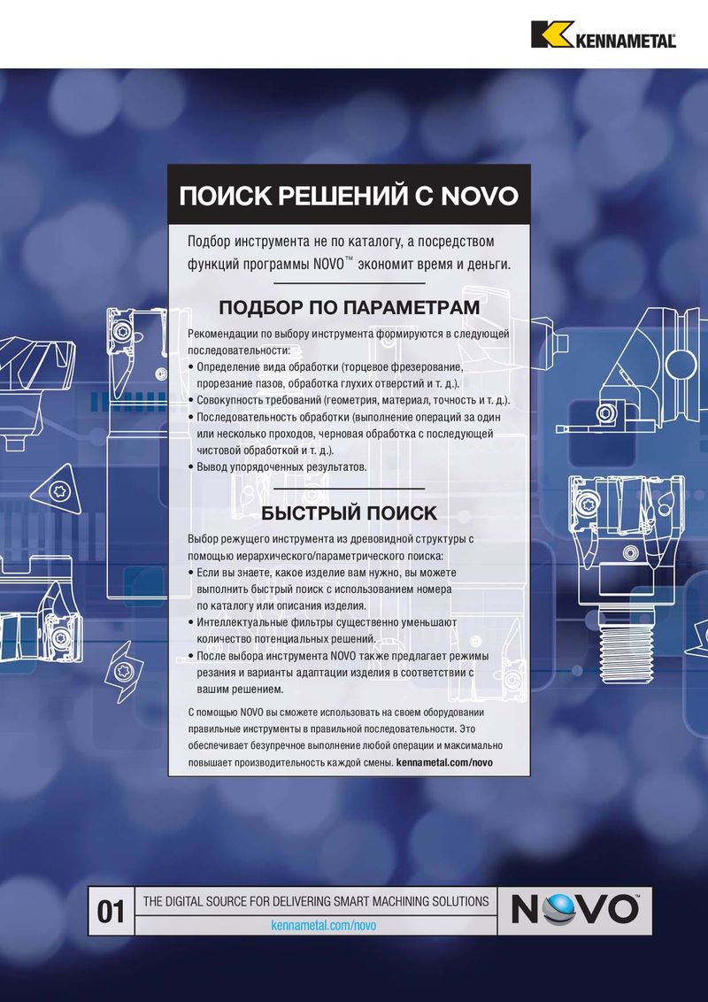 ПОИСК РЕШЕНИЙ С NOVO Подбор инструмента не по каталогу, а посредством функций программы NOVO™ экономит время и деньги. ПОДБОР ПО ПАРАМЕТРАМ Рекомендации по выбору инструмента формируются в следующей последовательности: • Определение вида обработки (торцевое фрезерование, прорезание пазов, обработка глухих отверстий и т. д.). • Совокупность требований (геометрия, материал, точность и т. д.). • Последовательность обработки (выполнение операций за один или несколько проходов, черновая обработка с последующей чистовой обработкой и т. д.). • Вывод упорядоченных результатов. БЫСТРЫЙ ПОИСК Выбор режущего инструмента из древовидной структуры с помощью иерархического/параметрического поиска: • Если вы знаете, какое изделие вам нужно, вы можете выполнить быстрый поиск с использованием номера по каталогу или описания изделия. • Интеллектуальные фильтры существенно уменьшают количество потенциальных решений. • После выбора инструмента NOVO также предлагает режимы резания и варианты адаптации изделия в соответствии с вашим решением. С помощью NOVO вы сможете использовать на своем оборудовании правильные инструменты в правильной последовательности. Это обеспечивает безупречное выполнение любой операции и максимально повышает производительность каждой смены. kennametal.com/novo kennametal.com/novo
