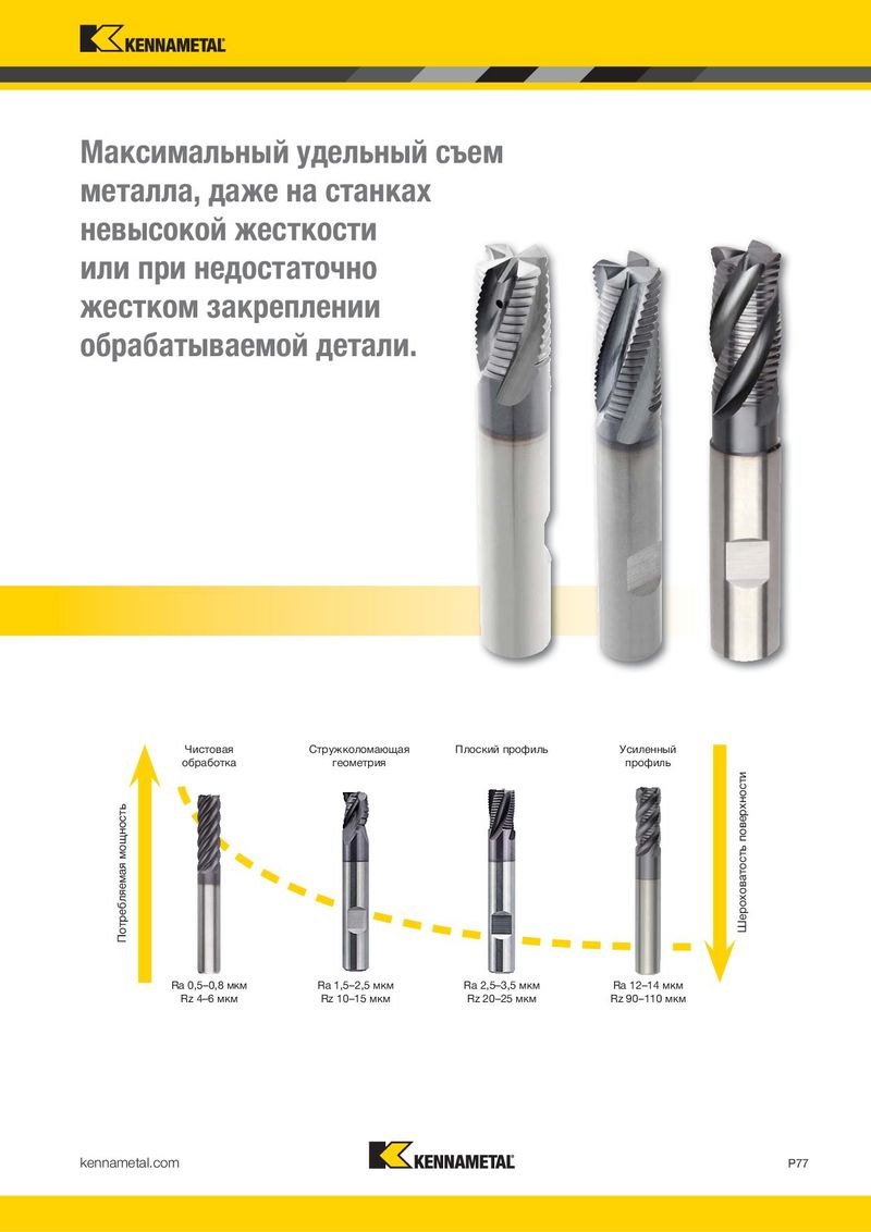 Максимальный удельный съем металла, даже на станках невысокой жесткости или при недостаточно жестком закреплении обрабатываемой детали. Чистовая Стружколомающая Плоский профиль Усиленный обработка геометрия профиль Потребляемая мощность Шероховатость поверхности Ra 0,5–0,8 мкм Ra 1,5–2,5 мкм Ra 2,5–3,5 мкм Ra 12–14 мкм Rz 4–6 мкм Rz 10–15 мкм Rz 20–25 мкм Rz 90–110 мкм kennametal.com P77