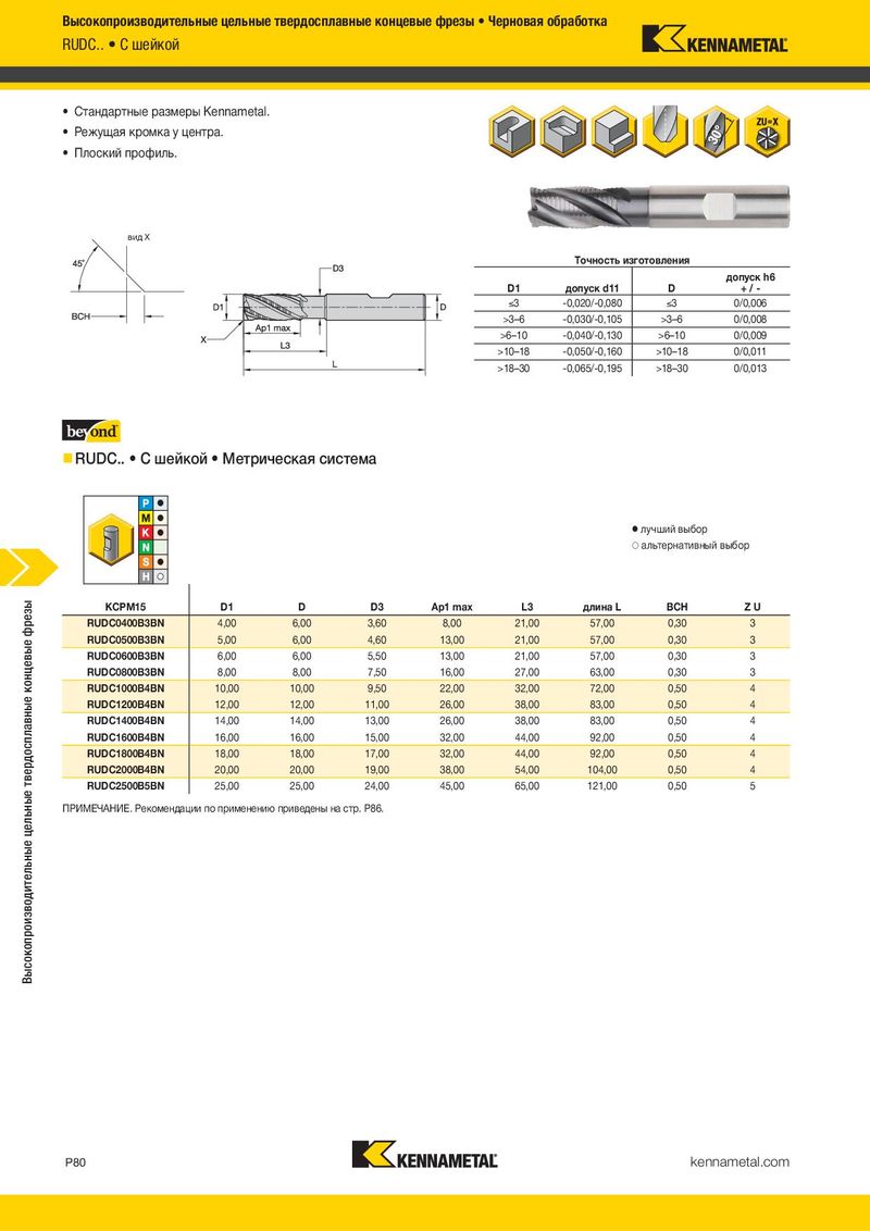 Высокопроизводительные цельные твердосплавные концевые фрезы • Черновая обработка RUDC.. • С шейкой • Стандартные размеры Kennametal. • Режущая кромка у центра. • Плоский профиль. вид X Tочность изготовления допуск h6 D1 допуск d11 D +/- )3 -0,020/-0,080 )3 0/0,006 >3–6 -0,030/-0,105 >3–6 0/0,008 >6–10 -0,040/-0,130 >6–10 0/0,009 >10–18 -0,050/-0,160 >10–18 0/0,011 >18–30 -0,065/-0,195 >18–30 0/0,013 RUDC.. • С шейкой • Метрическая система ⅷ лучший выбор ࠗ альтернативный выбор Высокопроизводительные цельные твердосплавные концевые фрезы KKCCPPMM1155 D1 D D3 Ap1 max L3 длина L BCH ZU RUDC0400B3BN 4,00 6,00 3,60 8,00 21,00 57,00 0,30 3 RUDC0500B3BN 5,00 6,00 4,60 13,00 21,00 57,00 0,30 3 RUDC0600B3BN 6,00 6,00 5,50 13,00 21,00 57,00 0,30 3 RUDC0800B3BN 8,00 8,00 7,50 16,00 27,00 63,00 0,30 3 RUDC1000B4BN 10,00 10,00 9,50 22,00 32,00 72,00 0,50 4 RUDC1200B4BN 12,00 12,00 11,00 26,00 38,00 83,00 0,50 4 RUDC1400B4BN 14,00 14,00 13,00 26,00 38,00 83,00 0,50 4 RUDC1600B4BN 16,00 16,00 15,00 32,00 44,00 92,00 0,50 4 RUDC1800B4BN 18,00 18,00 17,00 32,00 44,00 92,00 0,50 4 RUDC2000B4BN 20,00 20,00 19,00 38,00 54,00 104,00 0,50 4 RUDC2500B5BN 25,00 25,00 24,00 45,00 65,00 121,00 0,50 5 ПРИМЕЧАНИЕ. Рекомендации по применению приведены на стр. P86. P80 kennametal.com