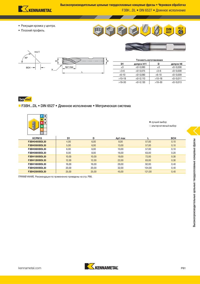 Высокопроизводительные цельные твердосплавные концевые фрезы • Черновая обработка F3BH...DL • DIN 6527 • Длинное исполнение • Режущая кромка у центра. • Плоский профиль. вид X Tочность изготовления D1 допуск h11 D допуск h6 )3 +0/-0,060 )3 +0/-0,006 >3–6 +0/-0,075 >3–6 +0/-0,008 >6–10 +0/-0,090 >6–10 +0/-0,009 >10–18 +0/-0,110 >10–18 +0/-0,011 >18–30 +0/-0,130 >18–30 +0/-0,013 F3BH...DL • DIN 6527 • Длинное исполнение • Метрическая система ⅷ лучший выбор ࠗ альтернативный выбор KCPM15 D1 D Ap1 max L BCH Высокопроизводительные цельные твердосплавные концевые фрезы F3BH0400BDL30 4,00 6,00 8,00 57,00 0,10 F3BH0500BDL30 5,00 6,00 13,00 57,00 0,10 F3BH0600BDL30 6,00 6,00 10,00 57,00 0,10 F3BH0800BDL30 8,00 8,00 16,00 63,00 0,20 F3BH1000BDL30 10,00 10,00 19,00 72,00 0,30 F3BH1200BDL30 12,00 12,00 22,00 83,00 0,30 F3BH1600BDL30 16,00 16,00 26,00 92,00 0,40 F3BH2000BDL30 20,00 20,00 32,00 104,00 0,40 F3BH2500BDL30 25,00 25,00 45,00 121,00 0,40 ПРИМЕЧАНИЕ. Рекомендации по применению приведены на стр. P86. kennametal.com P81