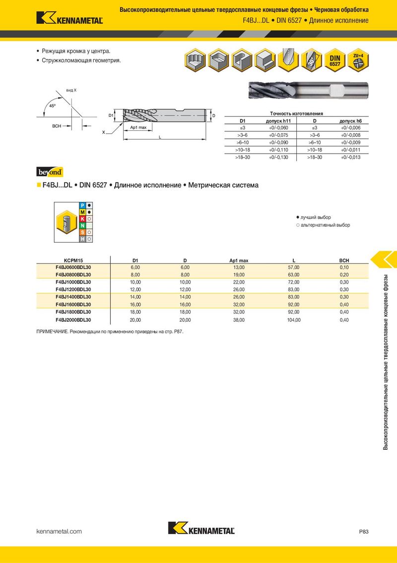 Высокопроизводительные цельные твердосплавные концевые фрезы • Черновая обработка F4BJ...DL • DIN 6527 • Длинное исполнение • Режущая кромка у центра. • Стружколомающая геометрия. вид X Tочность изготовления D1 допуск h11 D допуск h6 )3 +0/-0,060 )3 +0/-0,006 >3–6 +0/-0,075 >3–6 +0/-0,008 >6–10 +0/-0,090 >6–10 +0/-0,009 >10–18 +0/-0,110 >10–18 +0/-0,011 >18–30 +0/-0,130 >18–30 +0/-0,013 F4BJ...DL • DIN 6527 • Длинное исполнение • Метрическая система ⅷ лучший выбор ࠗ альтернативный выбор KCPM15 KCPM15 D1 D Ap1 max L BCH F4BJ0600BDL30 6,00 6,00 13,00 57,00 0,10 F4BJ0800BDL30 8,00 8,00 19,00 63,00 0,20 Высокопроизводительные цельные твердосплавные концевые фрезы F4BJ1000BDL30 10,00 10,00 22,00 72,00 0,30 F4BJ1200BDL30 12,00 12,00 26,00 83,00 0,30 F4BJ1400BDL30 14,00 14,00 26,00 83,00 0,30 F4BJ1600BDL30 16,00 16,00 32,00 92,00 0,40 F4BJ1800BDL30 18,00 18,00 32,00 92,00 0,40 F4BJ2000BDL30 20,00 20,00 38,00 104,00 0,40 ПРИМЕЧАНИЕ. Рекомендации по применению приведены на стр. P87. kennametal.com P83