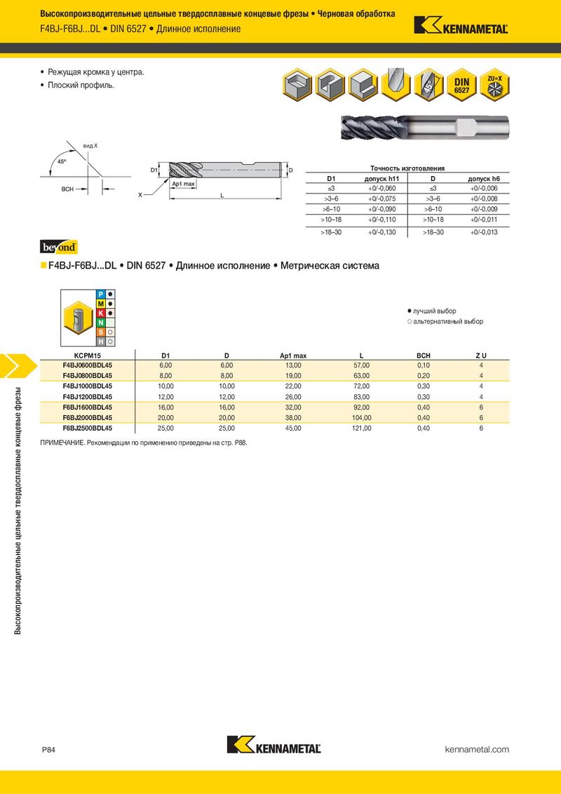 Высокопроизводительные цельные твердосплавные концевые фрезы • Черновая обработка F4BJ-F6BJ...DL • DIN 6527 • Длинное исполнение • Режущая кромка у центра. • Плоский профиль. вид X Tочность изготовления D1 допуск h11 D допуск h6 )3 +0/-0,060 )3 +0/-0,006 >3–6 +0/-0,075 >3–6 +0/-0,008 >6–10 +0/-0,090 >6–10 +0/-0,009 >10–18 +0/-0,110 >10–18 +0/-0,011 >18–30 +0/-0,130 >18–30 +0/-0,013 F4BJ-F6BJ...DL • DIN 6527 • Длинное исполнение • Метрическая система ⅷ лучший выбор ࠗ альтернативный выбор KCPM15 D1 D Ap1 max L BCH ZU F4BJ0600BDL45 6,00 6,00 13,00 57,00 0,10 4 F4BJ0800BDL45 8,00 8,00 19,00 63,00 0,20 4 Высокопроизводительные цельные твердосплавные концевые фрезы F4BJ1000BDL45 10,00 10,00 22,00 72,00 0,30 4 F4BJ1200BDL45 12,00 12,00 26,00 83,00 0,30 4 F6BJ1600BDL45 16,00 16,00 32,00 92,00 0,40 6 F6BJ2000BDL45 20,00 20,00 38,00 104,00 0,40 6 F6BJ2500BDL45 25,00 25,00 45,00 121,00 0,40 6 ПРИМЕЧАНИЕ. Рекомендации по применению приведены на стр. P88. P84 kennametal.com