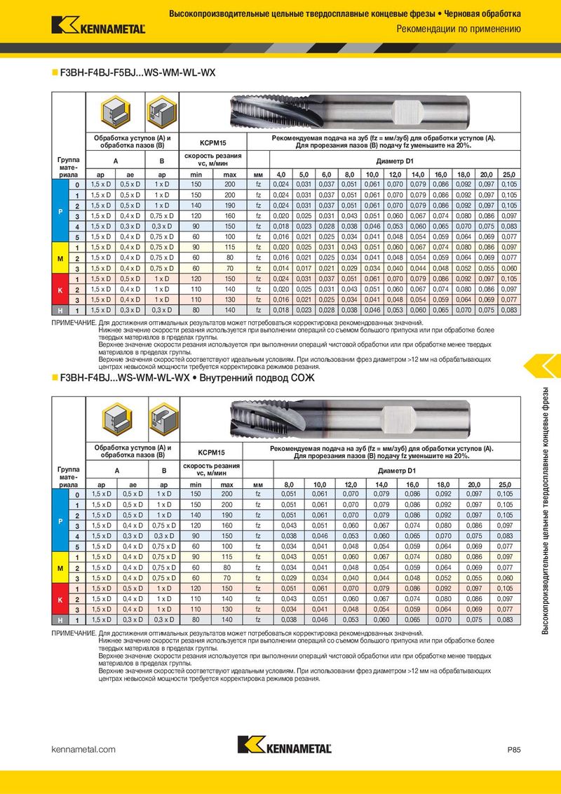 Высокопроизводительные цельные твердосплавные концевые фрезы • Черновая обработка Рекомендации по применению F3BH-F4BJ-F5BJ...WS-WM-WL-WX Обработка уступов (A) и KCPM15 Рекомендуемая подача на зуб (fz = мм/зуб) для обработки уступов (A). обработка пазов (B) Для прорезания пазов (B) подачу fz уменьшите на 20%. Группа A B скорость резания Диаметр D1 мате- vc, м/мин риала ap ae ap min max мм 4,0 5,0 6,0 8,0 10,0 12,0 14,0 16,0 18,0 20,0 25,0 0 1,5 x D 0,5 x D 1xD 150 200 fz 0,024 0,031 0,037 0,051 0,061 0,070 0,079 0,086 0,092 0,097 0,105 1 1,5 x D 0,5 x D 1xD 150 200 fz 0,024 0,031 0,037 0,051 0,061 0,070 0,079 0,086 0,092 0,097 0,105 2 1,5 x D 0,5 x D 1xD 140 190 fz 0,024 0,031 0,037 0,051 0,061 0,070 0,079 0,086 0,092 0,097 0,105 P 3 1,5 x D 0,4 x D 0,75 x D 120 160 fz 0,020 0,025 0,031 0,043 0,051 0,060 0,067 0,074 0,080 0,086 0,097 4 1,5 x D 0,3 x D 0,3 x D 90 150 fz 0,018 0,023 0,028 0,038 0,046 0,053 0,060 0,065 0,070 0,075 0,083 5 1,5 x D 0,4 x D 0,75 x D 60 100 fz 0,016 0,021 0,025 0,034 0,041 0,048 0,054 0,059 0,064 0,069 0,077 1 1,5 x D 0,4 x D 0,75 x D 90 115 fz 0,020 0,025 0,031 0,043 0,051 0,060 0,067 0,074 0,080 0,086 0,097 M 2 1,5 x D 0,4 x D 0,75 x D 60 80 fz 0,016 0,021 0,025 0,034 0,041 0,048 0,054 0,059 0,064 0,069 0,077 3 1,5 x D 0,4 x D 0,75 x D 60 70 fz 0,014 0,017 0,021 0,029 0,034 0,040 0,044 0,048 0,052 0,055 0,060 1 1,5 x D 0,5 x D 1xD 120 150 fz 0,024 0,031 0,037 0,051 0,061 0,070 0,079 0,086 0,092 0,097 0,105 K 2 1,5 x D 0,4 x D 1xD 110 140 fz 0,020 0,025 0,031 0,043 0,051 0,060 0,067 0,074 0,080 0,086 0,097 3 1,5 x D 0,4 x D 1xD 110 130 fz 0,016 0,021 0,025 0,034 0,041 0,048 0,054 0,059 0,064 0,069 0,077 H 1 1,5 x D 0,3 x D 0,3 x D 80 140 fz 0,018 0,023 0,028 0,038 0,046 0,053 0,060 0,065 0,070 0,075 0,083 ПРИМЕЧАНИЕ. Для достижения оптимальных результатов может потребоваться корректировка рекомендованных значений. Нижнее значение скорости резания используется при выполнении операций со съемом большого припуска или при обработке более твердых материалов в пределах группы. Верхнее значение скорости резания используется при выполнении операций чистовой обработки или при обработке менее твердых материалов в пределах группы. Верхние значения скоростей соответствуют идеальным условиям. При использовании фрез диаметром >12 мм на обрабатывающих центрах невысокой мощности требуется корректировка режимов резания. F3BH-F4BJ...WS-WM-WL-WX • Внутренний подвод СОЖ Обработка уступов (A) и KCPM15 Рекомендуемая подача на зуб (fz = мм/зуб) для обработки уступов (A). Высокопроизводительные цельные твердосплавные концевые фрезы обработка пазов (B) Для прорезания пазов (B) подачу fz уменьшите на 20%. Группа A B скорость резания Диаметр D1 мате- vc, м/мин риала ap ae ap min max мм 8,0 10,0 12,0 14,0 16,0 18,0 20,0 25,0 0 1,5 x D 0,5 x D 1xD 150 200 fz 0,051 0,061 0,070 0,079 0,086 0,092 0,097 0,105 1 1,5 x D 0,5 x D 1xD 150 200 fz 0,051 0,061 0,070 0,079 0,086 0,092 0,097 0,105 2 1,5 x D 0,5 x D 1xD 140 190 fz 0,051 0,061 0,070 0,079 0,086 0,092 0,097 0,105 P 3 1,5 x D 0,4 x D 0,75 x D 120 160 fz 0,043 0,051 0,060 0,067 0,074 0,080 0,086 0,097 4 1,5 x D 0,3 x D 0,3 x D 90 150 fz 0,038 0,046 0,053 0,060 0,065 0,070 0,075 0,083 5 1,5 x D 0,4 x D 0,75 x D 60 100 fz 0,034 0,041 0,048 0,054 0,059 0,064 0,069 0,077 1 1,5 x D 0,4 x D 0,75 x D 90 115 fz 0,043 0,051 0,060 0,067 0,074 0,080 0,086 0,097 M 2 1,5 x D 0,4 x D 0,75 x D 60 80 fz 0,034 0,041 0,048 0,054 0,059 0,064 0,069 0,077 3 1,5 x D 0,4 x D 0,75 x D 60 70 fz 0,029 0,034 0,040 0,044 0,048 0,052 0,055 0,060 1 1,5 x D 0,5 x D 1xD 120 150 fz 0,051 0,061 0,070 0,079 0,086 0,092 0,097 0,105 K 2 1,5 x D 0,4 x D 1xD 110 140 fz 0,043 0,051 0,060 0,067 0,074 0,080 0,086 0,097 3 1,5 x D 0,4 x D 1xD 110 130 fz 0,034 0,041 0,048 0,054 0,059 0,064 0,069 0,077 H 1 1,5 x D 0,3 x D 0,3 x D 80 140 fz 0,038 0,046 0,053 0,060 0,065 0,070 0,075 0,083 ПРИМЕЧАНИЕ. Для достижения оптимальных результатов может потребоваться корректировка рекомендованных значений. Нижнее значение скорости резания используется при выполнении операций со съемом большого припуска или при обработке более твердых материалов в пределах группы. Верхнее значение скорости резания используется при выполнении операций чистовой обработки или при обработке менее твердых материалов в пределах группы. Верхние значения скоростей соответствуют идеальным условиям. При использовании фрез диаметром >12 мм на обрабатывающих центрах невысокой мощности требуется корректировка режим