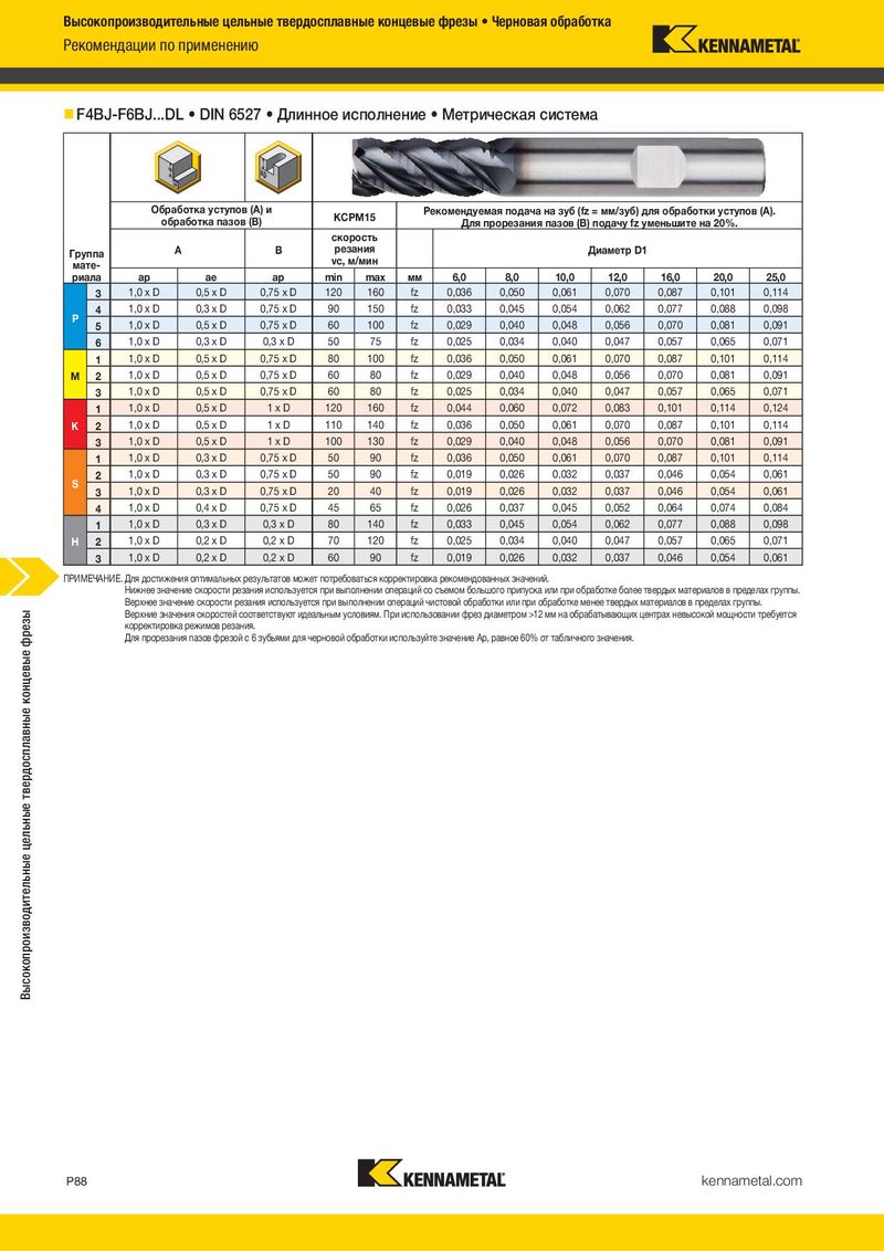 Высокопроизводительные цельные твердосплавные концевые фрезы • Черновая обработка Рекомендации по применению F4BJ-F6BJ...DL • DIN 6527 • Длинное исполнение • Метрическая система Обработка уступов (A) и KCPM15 Рекомендуемая подача на зуб (fz = мм/зуб) для обработки уступов (A). обработка пазов (B) Для прорезания пазов (B) подачу fz уменьшите на 20%. скорость Группа A B резания Диаметр D1 мате- vc, м/мин риала ap ae ap min max мм 6,0 8,0 10,0 12,0 16,0 20,0 25,0 3 1,0 x D 0,5 x D 0,75 x D 120 160 fz 0,036 0,050 0,061 0,070 0,087 0,101 0,114 P 4 1,0 x D 0,3 x D 0,75 x D 90 150 fz 0,033 0,045 0,054 0,062 0,077 0,088 0,098 5 1,0 x D 0,5 x D 0,75 x D 60 100 fz 0,029 0,040 0,048 0,056 0,070 0,081 0,091 6 1,0 x D 0,3 x D 0,3 x D 50 75 fz 0,025 0,034 0,040 0,047 0,057 0,065 0,071 1 1,0 x D 0,5 x D 0,75 x D 80 100 fz 0,036 0,050 0,061 0,070 0,087 0,101 0,114 M 2 1,0 x D 0,5 x D 0,75 x D 60 80 fz 0,029 0,040 0,048 0,056 0,070 0,081 0,091 3 1,0 x D 0,5 x D 0,75 x D 60 80 fz 0,025 0,034 0,040 0,047 0,057 0,065 0,071 1 1,0 x D 0,5 x D 1xD 120 160 fz 0,044 0,060 0,072 0,083 0,101 0,114 0,124 K 2 1,0 x D 0,5 x D 1xD 110 140 fz 0,036 0,050 0,061 0,070 0,087 0,101 0,114 3 1,0 x D 0,5 x D 1xD 100 130 fz 0,029 0,040 0,048 0,056 0,070 0,081 0,091 1 1,0 x D 0,3 x D 0,75 x D 50 90 fz 0,036 0,050 0,061 0,070 0,087 0,101 0,114 S 2 1,0 x D 0,3 x D 0,75 x D 50 90 fz 0,019 0,026 0,032 0,037 0,046 0,054 0,061 3 1,0 x D 0,3 x D 0,75 x D 20 40 fz 0,019 0,026 0,032 0,037 0,046 0,054 0,061 4 1,0 x D 0,4 x D 0,75 x D 45 65 fz 0,026 0,037 0,045 0,052 0,064 0,074 0,084 1 1,0 x D 0,3 x D 0,3 x D 80 140 fz 0,033 0,045 0,054 0,062 0,077 0,088 0,098 H 2 1,0 x D 0,2 x D 0,2 x D 70 120 fz 0,025 0,034 0,040 0,047 0,057 0,065 0,071 3 1,0 x D 0,2 x D 0,2 x D 60 90 fz 0,019 0,026 0,032 0,037 0,046 0,054 0,061 ПРИМЕЧАНИЕ. Для достижения оптимальных результатов может потребоваться корректировка рекомендованных значений. Нижнее значение скорости резания используется при выполнении операций со съемом большого припуска или при обработке более твердых материалов в пределах группы. Верхнее значение скорости резания используется при выполнении операций чистовой обработки или при обработке менее твердых материалов в пределах группы. Высокопроизводительные цельные твердосплавные концевые фрезы Верхние значения скоростей соответствуют идеальным условиям. При использовании фрез диаметром >12 мм на обрабатывающих центрах невысокой мощности требуется корректировка режимов резания. Для прорезания пазов фрезой с 6 зубьями для черновой обработки используйте значение Ap, равное 60% от табличного значения. P88 kennametal.com