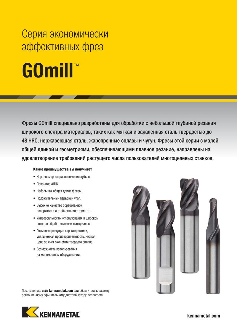 Серия экономически эффективных фрез GOmill™ Фрезы GOmill специально разработаны для обработки с небольшой глубиной резания широкого спектра материалов, таких как мягкая и закаленная сталь твердостью до 48 HRC, нержавеющая сталь, жаропрочные сплавы и чугун. Фрезы этой серии с малой общей длиной и геометриями, обеспечивающими плавное резание, направлены на удовлетворение требований растущего числа пользователей многоцелевых станков. Какие преимущества вы получите? • Неравномерное расположение зубьев. • Покрытие AITiN. • Небольшая общая длина фрезы. • Положительный передний угол. • Высокие качество обработанной поверхности и стойкость инструмента. • Универсальность использования в широком спектре обрабатываемых материалов. • Отличные режущие характеристики, увеличенная производительность, низкая цена за счет экономии твердого сплава. • Возможность использования на маломощном оборудовании. Посетите наш сайт kennametal.com или обратитесь к вашему региональному официальному дистрибьютору Kennametal. kennametal.com