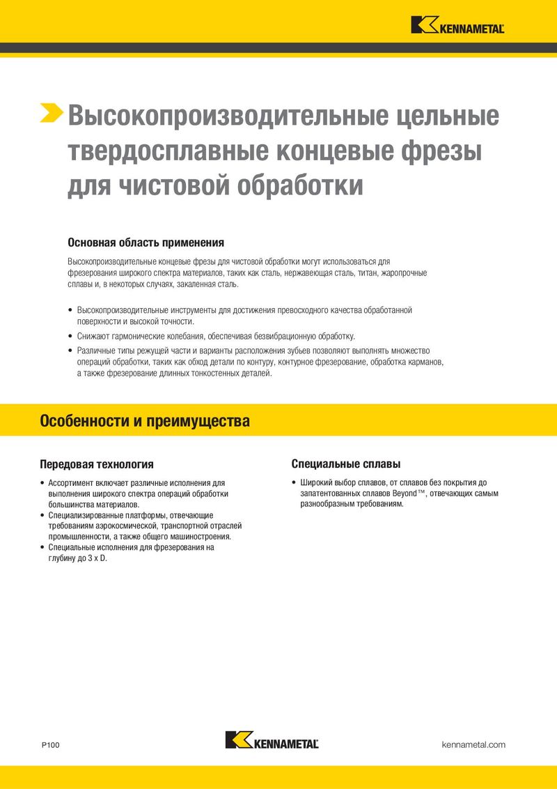 Высокопроизводительные цельные твердосплавные концевые фрезы для чистовой обработки Основная область применения Высокопроизводительные концевые фрезы для чистовой обработки могут использоваться для фрезерования широкого спектра материалов, таких как сталь, нержавеющая сталь, титан, жаропрочные сплавы и, в некоторых случаях, закаленная сталь. • Высокопроизводительные инструменты для достижения превосходного качества обработанной поверхности и высокой точности. • Снижают гармонические колебания, обеспечивая безвибрационную обработку. • Различные типы режущей части и варианты расположения зубьев позволяют выполнять множество операций обработки, таких как обход детали по контуру, контурное фрезерование, обработка карманов, а также фрезерование длинных тонкостенных деталей. Особенности и преимущества Передовая технология Специальные сплавы • Ассортимент включает различные исполнения для • Широкий выбор сплавов, от сплавов без покрытия до выполнения широкого спектра операций обработки запатентованных сплавов Beyond™, отвечающих самым большинства материалов. разнообразным требованиям. • Специализированные платформы, отвечающие требованиям аэрокосмической, транспортной отраслей промышленности, а также общего машиностроения. • Специальные исполнения для фрезерования на глубину до 3 x D. P100 kennametal.com