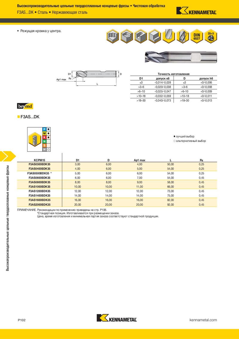 Высокопроизводительные цельные твердосплавные концевые фрезы • Чистовая обработка F3AS...DK • Сталь • Нержавеющая сталь • Режущая кромка у центра. Точность изготовления D1 допуск e8 D допуск h6 )3 -0,014/-0,028 )3 +0/-0,006 >3–6 -0,020/-0,038 >3–6 +0/-0,008 >6–10 -0,025/-0,047 >6–10 +0/-0,009 >10–18 -0,032/-0,059 >10–18 +0/-0,011 >18–30 -0,040/-0,073 >18–30 +0/-0,013 F3AS...DK ⅷ лучший выбор ࠗ альтернативный выбор KCPM15 KCPM15 D1 D Ap1 max L R¡ Высокопроизводительные цельные твердосплавные концевые фрезы F3AS0300BDK35 3,00 6,00 4,00 50,00 0,25 F3AS0400BDK35 4,00 6,00 5,00 54,00 0,25 F3AS0500BDK35 * 5,00 6,00 6,00 54,00 0,25 F3AS0600BDK35 6,00 6,00 7,00 54,00 0,45 F3AS0800BDK35 8,00 8,00 9,00 58,00 0,45 F3AS1000BDK35 10,00 10,00 11,00 66,00 0,45 F3AS1200BDK35 12,00 12,00 12,00 73,00 0,45 F3AS1400BDK35 14,00 14,00 14,00 75,00 0,45 F3AS1600BDK35 16,00 16,00 16,00 82,00 0,45 F3AS2000BDK35 20,00 20,00 20,00 92,00 0,45 ПРИМЕЧАНИЕ. Рекомендации по применению приведены на стр. P106. *Стандартная позиция. Изготавливается при размещении заказа. Цена, время изготовления и минимальная партия заказа соответствуют стандартной продукции. P102 kennametal.com