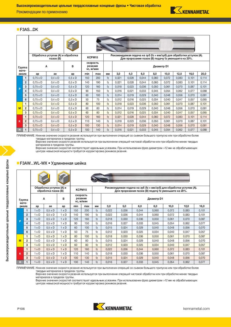 Высокопроизводительные цельные твердосплавные концевые фрезы • Чистовая обработка Рекомендации по применению F3AS...DK Обработка уступов (A) и обработка KCPM15 Рекомендуемая подача на зуб (fz = мм/зуб) для обработки уступов (A). пазов (B) Для прорезания пазов (B) подачу fz уменьшите на 20%. скорость Группа A B резания Диаметр D1 мате- vc, м/мин риала ap ae ap min max мм 3,0 4,0 6,0 8,0 10,0 12,0 16,0 20,0 1 0,75 x D 0,4 x D 0,5 x D 150 200 fz 0,021 0,028 0,044 0,060 0,072 0,083 0,101 0,114 2 0,75 x D 0,4 x D 0,5 x D 140 190 fz 0,021 0,028 0,044 0,060 0,072 0,083 0,101 0,114 P 3 0,75 x D 0,4 x D 0,5 x D 120 160 fz 0,018 0,023 0,036 0,050 0,061 0,070 0,087 0,101 4 0,75 x D 0,4 x D 0,3 x D 90 150 fz 0,016 0,021 0,033 0,045 0,054 0,062 0,077 0,088 5 0,75 x D 0,4 x D 0,5 x D 60 100 fz 0,014 0,019 0,029 0,040 0,048 0,056 0,070 0,081 6 0,75 x D 0,4 x D 0,3 x D 50 75 fz 0,012 0,016 0,025 0,034 0,040 0,047 0,057 0,065 1 0,75 x D 0,4 x D 0,5 x D 80 100 fz 0,018 0,023 0,036 0,050 0,061 0,070 0,087 0,101 M 2 0,75 x D 0,4 x D 0,5 x D 60 80 fz 0,014 0,019 0,029 0,040 0,048 0,056 0,070 0,081 3 0,75 x D 0,4 x D 0,5 x D 60 80 fz 0,012 0,016 0,025 0,034 0,040 0,047 0,057 0,065 1 0,75 x D 0,4 x D 0,5 x D 120 160 fz 0,021 0,028 0,044 0,060 0,072 0,083 0,101 0,114 K 2 0,75 x D 0,4 x D 0,5 x D 110 140 fz 0,018 0,023 0,036 0,050 0,061 0,070 0,087 0,101 3 0,75 x D 0,4 x D 0,5 x D 100 130 fz 0,014 0,019 0,029 0,040 0,048 0,056 0,070 0,081 H 1 0,75 x D 0,4 x D 0,3 x D 100 140 fz 0,016 0,021 0,033 0,045 0,054 0,062 0,077 0,088 ПРИМЕЧАНИЕ. Нижнее значение скорости резания используется при выполнении операций со съемом большого припуска или при обработке более твердых материалов в пределах группы. Верхнее значение скорости резания используется при выполнении операций чистовой обработки или при обработке менее твердых материалов в пределах группы. Верхние значения скоростей соответствуют идеальным условиям. При использовании фрез диаметром >12 мм на обрабатывающих центрах невысокой мощности требуется корректировка режимов резания. Высокопроизводительные цельные твердосплавные концевые фрезы F3AW...WL-WX • Удлиненная шейка Обработка уступов (A) и KCPM15 Рекомендуемая подача на зуб (fz = мм/зуб) для обработки уступов (A). обработка пазов (B) Для прорезания пазов (B) подачу fz уменьшите на 20%. скорость Группа A B резания Диаметр D1 мате- vc, м/мин риала ap ae ap min max мм 3,0 5,0 6,0 8,0 10,0 12,0 16,0 1 1xD 0,5 x D 1xD 150 200 fz 0,022 0,036 0,044 0,060 0,072 0,083 0,101 2 1xD 0,5 x D 1xD 140 190 fz 0,022 0,036 0,044 0,060 0,072 0,083 0,101 P 3 1xD 0,5 x D 1xD 120 160 fz 0,018 0,030 0,036 0,050 0,061 0,070 0,087 4 1xD 0,5 x D 1xD 90 150 fz 0,016 0,027 0,033 0,045 0,054 0,062 0,077 5 1xD 0,5 x D 1xD 60 100 fz 0,015 0,024 0,029 0,040 0,048 0,056 0,070 6 1xD 0,5 x D 1xD 50 75 fz 0,012 0,020 0,025 0,034 0,040 0,047 0,057 1 1xD 0,5 x D 1xD 80 100 fz 0,018 0,030 0,036 0,050 0,061 0,070 0,087 M 2 1xD 0,5 x D 1xD 60 80 fz 0,015 0,024 0,029 0,040 0,048 0,056 0,070 3 1xD 0,5 x D 1xD 60 80 fz 0,012 0,020 0,025 0,034 0,040 0,047 0,057 1 1xD 0,5 x D 1xD 120 160 fz 0,022 0,036 0,044 0,060 0,072 0,083 0,101 K 2 1xD 0,5 x D 1xD 110 140 fz 0,018 0,030 0,036 0,050 0,061 0,070 0,087 3 1xD 0,5 x D 1xD 100 130 fz 0,015 0,024 0,029 0,040 0,048 0,056 0,070 H 1 1xD 0,5 x D 1xD 100 140 fz 0,016 0,027 0,033 0,045 0,054 0,062 0,077 ПРИМЕЧАНИЕ. Нижнее значение скорости резания используется при выполнении операций со съемом большого припуска или при обработке более твердых материалов в пределах группы. Верхнее значение скорости резания используется при выполнении операций чистовой обработки или при обработке менее твердых материалов в пределах группы. Верхние значения скоростей соответствуют идеальным условиям. При использовании фрез диаметром >12 мм на обрабатывающих центрах невысокой мощности требуется корректировка режимов резания. P106 kennametal.com