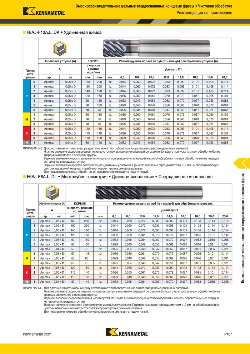 Высокопроизводительные цельные твердосплавные концевые фрезы • Чистовая обработка Рекомендации по применению F8AJ-F10AJ...DK • Удлиненная шейка Обработка уступов (A) KCPM15 Рекомендуемая подача на зуб (fz = мм/зуб) для обработки уступов (A). скорость Группа A резания Диаметр D1 мате- vc, м/мин риала ap ae min max мм 6,0 8,0 10,0 12,0 14,0 16,0 18,0 20,0 0 Ap max 0,05 x D 150 200 fz 0,044 0,060 0,072 0,083 0,092 0,101 0,108 0,114 1 Ap max 0,05 x D 150 200 fz 0,044 0,060 0,072 0,083 0,092 0,101 0,108 0,114 2 Ap max 0,05 x D 140 190 fz 0,044 0,060 0,072 0,083 0,092 0,101 0,108 0,114 P 3 Ap max 0,05 x D 120 160 fz 0,036 0,050 0,061 0,070 0,079 0,087 0,095 0,101 4 Ap max 0,05 x D 90 150 fz 0,033 0,045 0,054 0,062 0,070 0,077 0,083 0,088 5 Ap max 0,05 x D 60 100 fz 0,029 0,040 0,048 0,056 0,063 0,070 0,076 0,081 6 Ap max 0,04 x D 50 75 fz 0,025 0,034 0,040 0,047 0,052 0,057 0,061 0,065 1 Ap max 0,05 x D 90 115 fz 0,036 0,050 0,061 0,070 0,079 0,087 0,095 0,101 M 2 Ap max 0,05 x D 60 80 fz 0,029 0,040 0,048 0,056 0,063 0,070 0,076 0,081 3 Ap max 0,05 x D 60 70 fz 0,025 0,034 0,040 0,047 0,052 0,057 0,061 0,065 1 Ap max 0,05 x D 120 150 fz 0,044 0,060 0,072 0,083 0,092 0,101 0,108 0,114 K 2 Ap max 0,05 x D 110 140 fz 0,036 0,050 0,061 0,070 0,079 0,087 0,095 0,101 3 Ap max 0,05 x D 110 130 fz 0,029 0,040 0,048 0,056 0,063 0,070 0,076 0,081 H 1 Ap max 0,04 x D 80 140 fz 0,033 0,045 0,054 0,062 0,070 0,077 0,083 0,088 ПРИМЕЧАНИЕ. Для достижения оптимальных результатов может потребоваться корректировка рекомендованных значений. Нижнее значение скорости резания используется при выполнении операций со съемом большого припуска или при обработке более твердых материалов в пределах группы. Верхнее значение скорости резания используется при выполнении операций чистовой обработки или при обработке менее твердых материалов в пределах группы. Верхние значения скоростей соответствуют идеальным условиям. При использовании фрез диаметром >12 мм на обрабатывающих центрах невысокой мощности требуется корректировка режимов резания. Для повышения качества обработанной поверхности уменьшите подачу на зуб. Высокопроизводительные цельные твердосплавные концевые фрезы F6AJ-F8AJ...DL • Многозубая геометрия • Длинное исполнение • Сверхдлинное исполнение Обработка уступов (A) KCPM15 Рекомендуемая подача на зуб (fz = мм/зуб) для обработки уступов (A). Группа A скорость резания Диаметр D1 мате- vc, м/мин риала ap ae min max мм 6,0 8,0 10,0 12,0 14,0 16,0 18,0 20,0 25,0 0 Ap max 0,05 x D 150 200 fz 0,044 0,060 0,072 0,083 0,092 0,101 0,108 0,114 0,124 1 Ap max 0,05 x D 150 200 fz 0,044 0,060 0,072 0,083 0,092 0,101 0,108 0,114 0,124 2 Ap max 0,05 x D 140 190 fz 0,044 0,060 0,072 0,083 0,092 0,101 0,108 0,114 0,124 P 3 Ap max 0,05 x D 120 160 fz 0,036 0,050 0,061 0,070 0,079 0,087 0,095 0,101 0,114 4 Ap max 0,05 x D 90 150 fz 0,033 0,045 0,054 0,062 0,070 0,077 0,083 0,088 0,098 5 Ap max 0,05 x D 60 100 fz 0,029 0,040 0,048 0,056 0,063 0,070 0,076 0,081 0,091 6 Ap max 0,04 x D 50 75 fz 0,025 0,034 0,040 0,047 0,052 0,057 0,061 0,065 0,071 1 Ap max 0,05 x D 90 115 fz 0,036 0,050 0,061 0,070 0,079 0,087 0,095 0,101 0,114 M 2 Ap max 0,05 x D 60 80 fz 0,029 0,040 0,048 0,056 0,063 0,070 0,076 0,081 0,091 3 Ap max 0,05 x D 60 70 fz 0,025 0,034 0,040 0,047 0,052 0,057 0,061 0,065 0,071 1 Ap max 0,05 x D 120 150 fz 0,044 0,060 0,072 0,083 0,092 0,101 0,108 0,114 0,124 K 2 Ap max 0,05 x D 110 140 fz 0,036 0,050 0,061 0,070 0,079 0,087 0,095 0,101 0,114 3 Ap max 0,05 x D 110 130 fz 0,029 0,040 0,048 0,056 0,063 0,070 0,076 0,081 0,091 H 1 Ap max 0,04 x D 80 140 fz 0,033 0,045 0,054 0,062 0,070 0,077 0,083 0,088 0,098 ПРИМЕЧАНИЕ. Для достижения оптимальных результатов может потребоваться корректировка рекомендованных значений. Нижнее значение скорости резания используется при выполнении операций со съемом большого припуска или при обработке более твердых материалов в пределах группы. Верхнее значение скорости резания используется при выполнении операций чистовой обработки или при обработке менее твердых материалов в пределах группы. Верхние значения скоростей соответствуют идеальным условиям. При использовании фрез диаметром >12 мм на обрабатывающих центрах невысокой мощности требуется корректировка режимов резания. Для повышения качества обработанной поверхности уменьшите подачу на зуб. kennametal.com P107