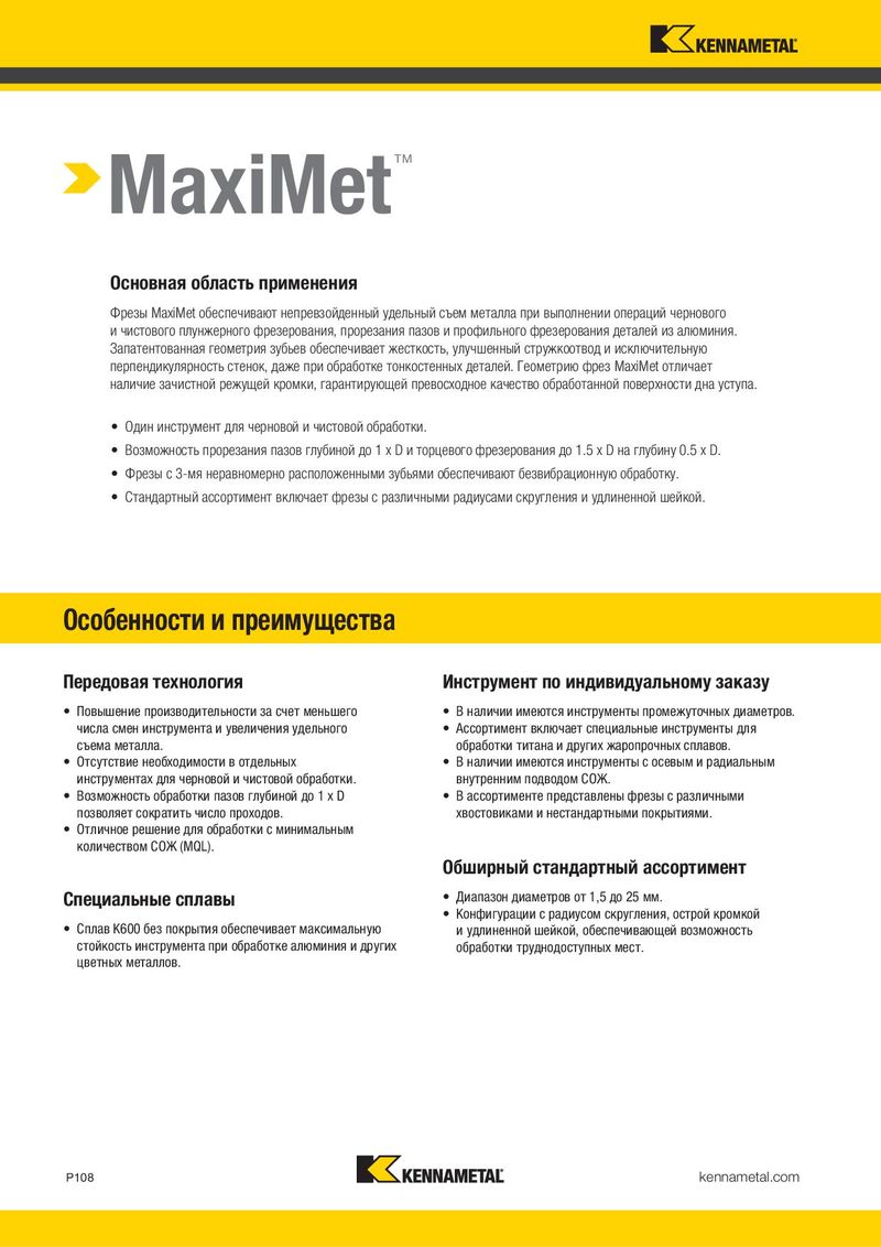 MaxiMet™ Основная область применения Фрезы MaxiMet обеспечивают непревзойденный удельный съем металла при выполнении операций чернового и чистового плунжерного фрезерования, прорезания пазов и профильного фрезерования деталей из алюминия. Запатентованная геометрия зубьев обеспечивает жесткость, улучшенный стружкоотвод и исключительную перпендикулярность стенок, даже при обработке тонкостенных деталей. Геометрию фрез MaxiMet отличает наличие зачистной режущей кромки, гарантирующей превосходное качество обработанной поверхности дна уступа. • Один инструмент для черновой и чистовой обработки. • Возможность прорезания пазов глубиной до 1 x D и торцевого фрезерования до 1.5 x D на глубину 0.5 x D. • Фрезы с 3-мя неравномерно расположенными зубьями обеспечивают безвибрационную обработку. • Стандартный ассортимент включает фрезы с различными радиусами скругления и удлиненной шейкой. Особенности и преимущества Передовая технология Инструмент по индивидуальному заказу • Повышение производительности за счет меньшего • В наличии имеются инструменты промежуточных диаметров. числа смен инструмента и увеличения удельного • Ассортимент включает специальные инструменты для съема металла. обработки титана и других жаропрочных сплавов. • Отсутствие необходимости в отдельных • В наличии имеются инструменты с осевым и радиальным инструментах для черновой и чистовой обработки. внутренним подводом СОЖ. • Возможность обработки пазов глубиной до 1 x D • В ассортименте представлены фрезы с различными позволяет сократить число проходов. хвостовиками и нестандартными покрытиями. • Отличное решение для обработки с минимальным количеством СОЖ (MQL). Обширный стандартный ассортимент Специальные сплавы • Диапазон диаметров от 1,5 до 25 мм. • Конфигурации с радиусом скругления, острой кромкой • Сплав K600 без покрытия обеспечивает максимальную и удлиненной шейкой, обеспечивающей возможность стойкость инструмента при обработке алюминия и других обработки труднодоступных мест. цветных металлов. P108 kennametal.com