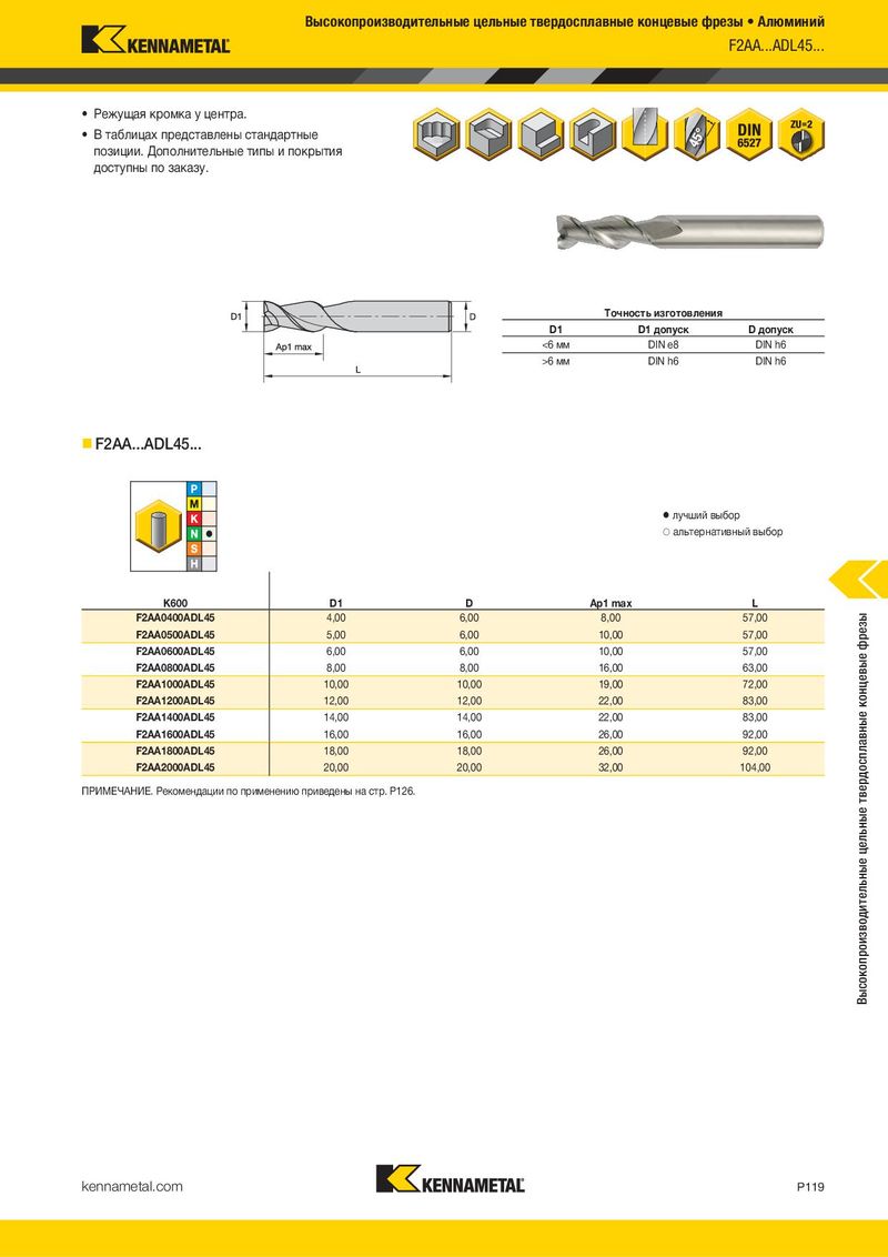 Высокопроизводительные цельные твердосплавные концевые фрезы • Алюминий F2AA...ADL45... • Режущая кромка у центра. • В таблицах представлены стандартные позиции. Дополнительные типы и покрытия доступны по заказу. Tочность изготовления D1 D1 допуск D допуск <6 мм DIN e8 DIN h6 >6 мм DIN h6 DIN h6 F2AA...ADL45... ⅷ лучший выбор ࠗ альтернативный выбор K600 K600 D1 D Ap1 max L F2AA0400ADL45 4,00 6,00 8,00 57,00 Высокопроизводительные цельные твердосплавные концевые фрезы F2AA0500ADL45 5,00 6,00 10,00 57,00 F2AA0600ADL45 6,00 6,00 10,00 57,00 F2AA0800ADL45 8,00 8,00 16,00 63,00 F2AA1000ADL45 10,00 10,00 19,00 72,00 F2AA1200ADL45 12,00 12,00 22,00 83,00 F2AA1400ADL45 14,00 14,00 22,00 83,00 F2AA1600ADL45 16,00 16,00 26,00 92,00 F2AA1800ADL45 18,00 18,00 26,00 92,00 F2AA2000ADL45 20,00 20,00 32,00 104,00 ПРИМЕЧАНИЕ. Рекомендации по применению приведены на стр. P126. kennametal.com P119