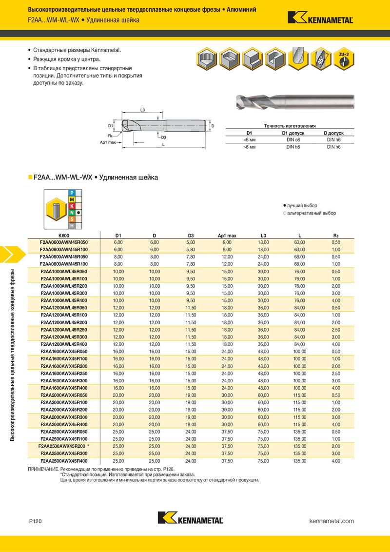 Высокопроизводительные цельные твердосплавные концевые фрезы • Алюминий F2AA...WM-WL-WX • Удлиненная шейка • Стандартные размеры Kennametal. • Режущая кромка у центра. • В таблицах представлены стандартные позиции. Дополнительные типы и покрытия доступны по заказу. Tочность изготовления D1 D1 допуск D допуск <6 мм DIN e8 DIN h6 >6 мм DIN h6 DIN h6 F2AA...WM-WL-WX • Удлиненная шейка ⅷ лучший выбор ࠗ альтернативный выбор K600 D1 D D3 Ap1 max L3 L R¡ F2AA0600AWM45R050 6,00 6,00 5,80 9,00 18,00 63,00 0,50 F2AA0600AWM45R100 6,00 6,00 5,80 9,00 18,00 63,00 1,00 F2AA0800AWM45R050 8,00 8,00 7,80 12,00 24,00 68,00 0,50 F2AA0800AWM45R100 8,00 8,00 7,80 12,00 24,00 68,00 1,00 Высокопроизводительные цельные твердосплавные концевые фрезы F2AA1000AWL45R050 10,00 10,00 9,50 15,00 30,00 76,00 0,50 F2AA1000AWL45R100 10,00 10,00 9,50 15,00 30,00 76,00 1,00 F2AA1000AWL45R200 10,00 10,00 9,50 15,00 30,00 76,00 2,00 F2AA1000AWL45R300 10,00 10,00 9,50 15,00 30,00 76,00 3,00 F2AA1000AWL45R400 10,00 10,00 9,50 15,00 30,00 76,00 4,00 F2AA1200AWL45R050 12,00 12,00 11,50 18,00 36,00 84,00 0,50 F2AA1200AWL45R100 12,00 12,00 11,50 18,00 36,00 84,00 1,00 F2AA1200AWL45R200 12,00 12,00 11,50 18,00 36,00 84,00 2,00 F2AA1200AWL45R250 12,00 12,00 11,50 18,00 36,00 84,00 2,50 F2AA1200AWL45R300 12,00 12,00 11,50 18,00 36,00 84,00 3,00 F2AA1200AWL45R400 12,00 12,00 11,50 18,00 36,00 84,00 4,00 F2AA1600AWX45R050 16,00 16,00 15,00 24,00 48,00 100,00 0,50 F2AA1600AWX45R100 16,00 16,00 15,00 24,00 48,00 100,00 1,00 F2AA1600AWX45R200 16,00 16,00 15,00 24,00 48,00 100,00 2,00 F2AA1600AWX45R250 16,00 16,00 15,00 24,00 48,00 100,00 2,50 F2AA1600AWX45R300 16,00 16,00 15,00 24,00 48,00 100,00 3,00 F2AA1600AWX45R400 16,00 16,00 15,00 24,00 48,00 100,00 4,00 F2AA2000AWX45R050 20,00 20,00 19,00 30,00 60,00 115,00 0,50 F2AA2000AWX45R100 20,00 20,00 19,00 30,00 60,00 115,00 1,00 F2AA2000AWX45R200 20,00 20,00 19,00 30,00 60,00 115,00 2,00 F2AA2000AWX45R300 20,00 20,00 19,00 30,00 60,00 115,00 3,00 F2AA2000AWX45R400 20,00 20,00 19,00 30,00 60,00 115,00 4,00 F2AA2500AWX45R050 25,00 25,00 24,00 37,50 75,00 135,00 0,50 F2AA2500AWX45R100 25,00 25,00 24,00 37,50 75,00 135,00 1,00 F2AA2500AWX45R200 * 25,00 25,00 24,00 37,50 75,00 135,00 2,00 F2AA2500AWX45R300 25,00 25,00 24,00 37,50 75,00 135,00 3,00 F2AA2500AWX45R400 25,00 25,00 24,00 37,50 75,00 135,00 4,00 ПРИМЕЧАНИЕ. Рекомендации по применению приведены на стр. P126. *Стандартная позиция. Изготавливается при размещении заказа. Цена, время изготовления и минимальная партия заказа соответствуют стандартной продукции. P120 kennametal.com