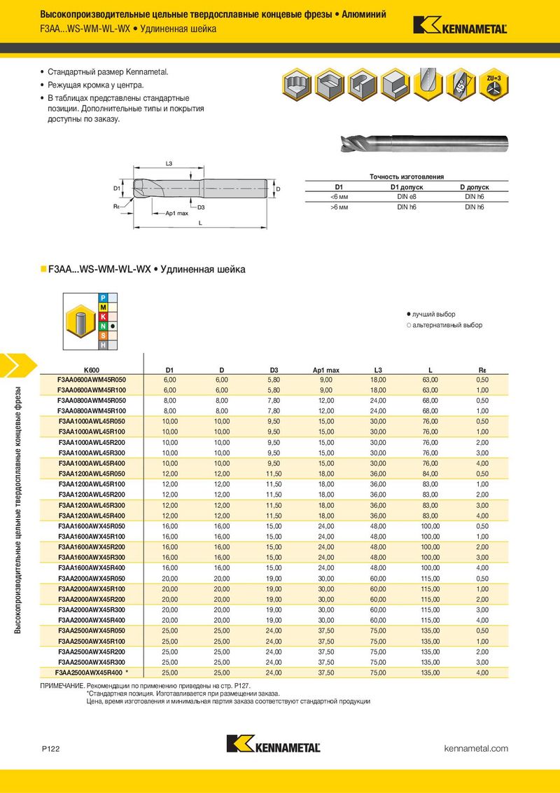 Высокопроизводительные цельные твердосплавные концевые фрезы • Алюминий F3AA...WS-WM-WL-WX • Удлиненная шейка • Стандартный размер Kennametal. • Режущая кромка у центра. • В таблицах представлены стандартные позиции. Дополнительные типы и покрытия доступны по заказу. Tочность изготовления D1 D1 допуск D допуск <6 мм DIN e8 DIN h6 >6 мм DIN h6 DIN h6 F3AA...WS-WM-WL-WX • Удлиненная шейка ⅷ лучший выбор ࠗ альтернативный выбор K600 K600 D1 D D3 Ap1 max L3 L R¡ F3AA0600AWM45R050 6,00 6,00 5,80 9,00 18,00 63,00 0,50 Высокопроизводительные цельные твердосплавные концевые фрезы F3AA0600AWM45R100 6,00 6,00 5,80 9,00 18,00 63,00 1,00 F3AA0800AWM45R050 8,00 8,00 7,80 12,00 24,00 68,00 0,50 F3AA0800AWM45R100 8,00 8,00 7,80 12,00 24,00 68,00 1,00 F3AA1000AWL45R050 10,00 10,00 9,50 15,00 30,00 76,00 0,50 F3AA1000AWL45R100 10,00 10,00 9,50 15,00 30,00 76,00 1,00 F3AA1000AWL45R200 10,00 10,00 9,50 15,00 30,00 76,00 2,00 F3AA1000AWL45R300 10,00 10,00 9,50 15,00 30,00 76,00 3,00 F3AA1000AWL45R400 10,00 10,00 9,50 15,00 30,00 76,00 4,00 F3AA1200AWL45R050 12,00 12,00 11,50 18,00 36,00 84,00 0,50 F3AA1200AWL45R100 12,00 12,00 11,50 18,00 36,00 83,00 1,00 F3AA1200AWL45R200 12,00 12,00 11,50 18,00 36,00 83,00 2,00 F3AA1200AWL45R300 12,00 12,00 11,50 18,00 36,00 83,00 3,00 F3AA1200AWL45R400 12,00 12,00 11,50 18,00 36,00 83,00 4,00 F3AA1600AWX45R050 16,00 16,00 15,00 24,00 48,00 100,00 0,50 F3AA1600AWX45R100 16,00 16,00 15,00 24,00 48,00 100,00 1,00 F3AA1600AWX45R200 16,00 16,00 15,00 24,00 48,00 100,00 2,00 F3AA1600AWX45R300 16,00 16,00 15,00 24,00 48,00 100,00 3,00 F3AA1600AWX45R400 16,00 16,00 15,00 24,00 48,00 100,00 4,00 F3AA2000AWX45R050 20,00 20,00 19,00 30,00 60,00 115,00 0,50 F3AA2000AWX45R100 20,00 20,00 19,00 30,00 60,00 115,00 1,00 F3AA2000AWX45R200 20,00 20,00 19,00 30,00 60,00 115,00 2,00 F3AA2000AWX45R300 20,00 20,00 19,00 30,00 60,00 115,00 3,00 F3AA2000AWX45R400 20,00 20,00 19,00 30,00 60,00 115,00 4,00 F3AA2500AWX45R050 25,00 25,00 24,00 37,50 75,00 135,00 0,50 F3AA2500AWX45R100 25,00 25,00 24,00 37,50 75,00 135,00 1,00 F3AA2500AWX45R200 25,00 25,00 24,00 37,50 75,00 135,00 2,00 F3AA2500AWX45R300 25,00 25,00 24,00 37,50 75,00 135,00 3,00 F3AA2500AWX45R400 * 25,00 25,00 24,00 37,50 75,00 135,00 4,00 ПРИМЕЧАНИЕ. Рекомендации по применению приведены на стр. P127. *Стандартная позиция. Изготавливается при размещении заказа. Цена, время изготовления и минимальная партия заказа соответствуют стандартной продукции P122 kennametal.com