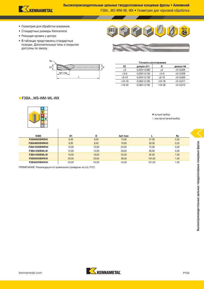 Высокопроизводительные цельные твердосплавные концевые фрезы • Алюминий F3BA...WS-WM-WL-WX • Геометрия для черновой обработки • Геометрия для обработки алюминия. • Стандартные размеры Kennametal. • Режущая кромка у центра. • В таблицах представлены стандартные позиции. Дополнительные типы и покрытия доступны по заказу. Tочность изготовления D1 допуск d11 D допуск h6 )3 -0,020/-0,080 )3 +0/-0,006 >3–6 -0,030/-0,105 >3–6 +0/-0,008 >6–10 -0,040/-0,130 >6–10 +0/-0,009 >10–18 -0,050/-0,160 >10–18 +0/-0,011 >18–30 -0,065/-0,195 >18–30 +0/-0,013 F3BA...WS-WM-WL-WX ⅷ лучший выбор ࠗ альтернативный выбор K600 K600 D1 D Ap1 max L R¡ F3BA0600BWS40 6,00 6,00 13,00 57,00 0,25 F3BA0800BWM40 8,00 8,00 16,00 63,00 0,25 Высокопроизводительные цельные твердосплавные концевые фрезы F3BA1000BWM40 10,00 10,00 22,00 72,00 0,50 F3BA1200BWL40 12,00 12,00 26,00 83,00 0,50 F3BA1600BWL40 16,00 16,00 32,00 92,00 1,00 F3BA2000BWX40 20,00 20,00 38,00 104,00 1,00 F3BA2500BWX40 25,00 25,00 45,00 121,00 1,50 ПРИМЕЧАНИЕ. Рекомендации по применению приведены на стр. P127. kennametal.com P123