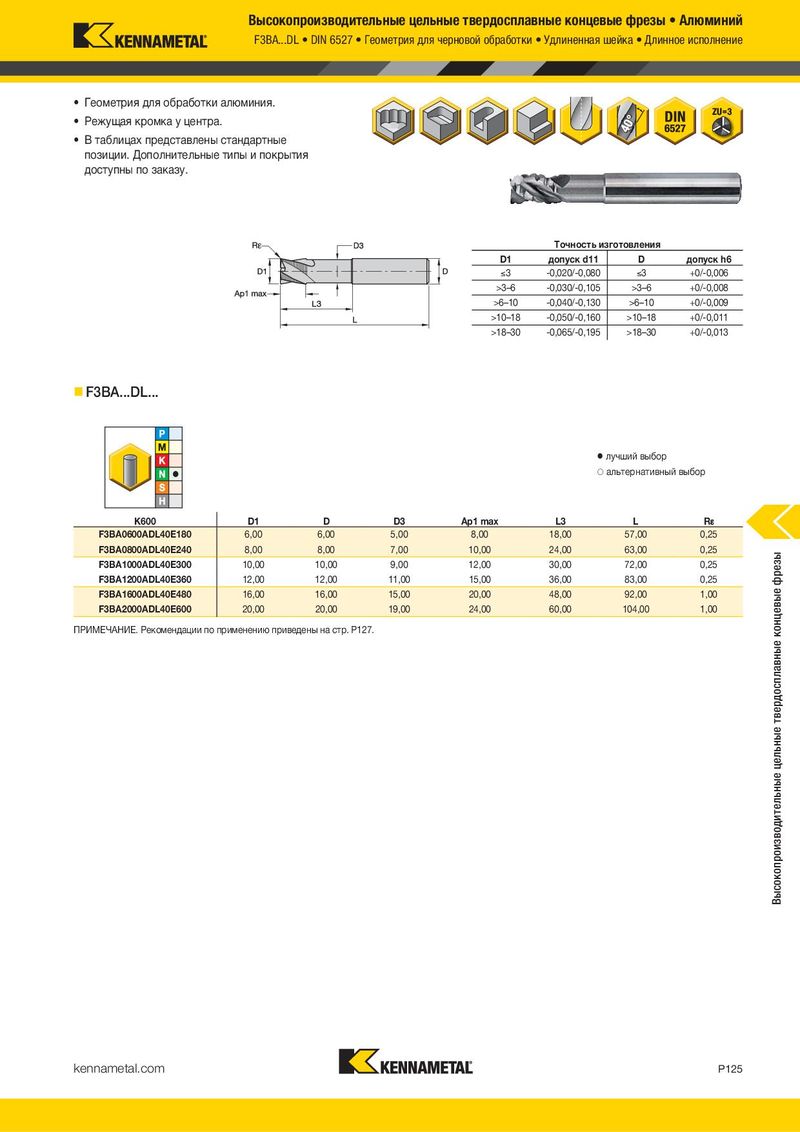 Высокопроизводительные цельные твердосплавные концевые фрезы • Алюминий F3BA...DL • DIN 6527 • Геометрия для черновой обработки • Удлиненная шейка • Длинное исполнение • Геометрия для обработки алюминия. • Режущая кромка у центра. • В таблицах представлены стандартные позиции. Дополнительные типы и покрытия доступны по заказу. Tочность изготовления D1 допуск d11 D допуск h6 )3 -0,020/-0,080 )3 +0/-0,006 >3–6 -0,030/-0,105 >3–6 +0/-0,008 >6–10 -0,040/-0,130 >6–10 +0/-0,009 >10–18 -0,050/-0,160 >10–18 +0/-0,011 >18–30 -0,065/-0,195 >18–30 +0/-0,013 F3BA...DL... ⅷ лучший выбор ࠗ альтернативный выбор K600 D1 D D3 Ap1 max L3 L R¡ F3BA0600ADL40E180 6,00 6,00 5,00 8,00 18,00 57,00 0,25 F3BA0800ADL40E240 8,00 8,00 7,00 10,00 24,00 63,00 0,25 Высокопроизводительные цельные твердосплавные концевые фрезы F3BA1000ADL40E300 10,00 10,00 9,00 12,00 30,00 72,00 0,25 F3BA1200ADL40E360 12,00 12,00 11,00 15,00 36,00 83,00 0,25 F3BA1600ADL40E480 16,00 16,00 15,00 20,00 48,00 92,00 1,00 F3BA2000ADL40E600 20,00 20,00 19,00 24,00 60,00 104,00 1,00 ПРИМЕЧАНИЕ. Рекомендации по применению приведены на стр. P127. kennametal.com P125