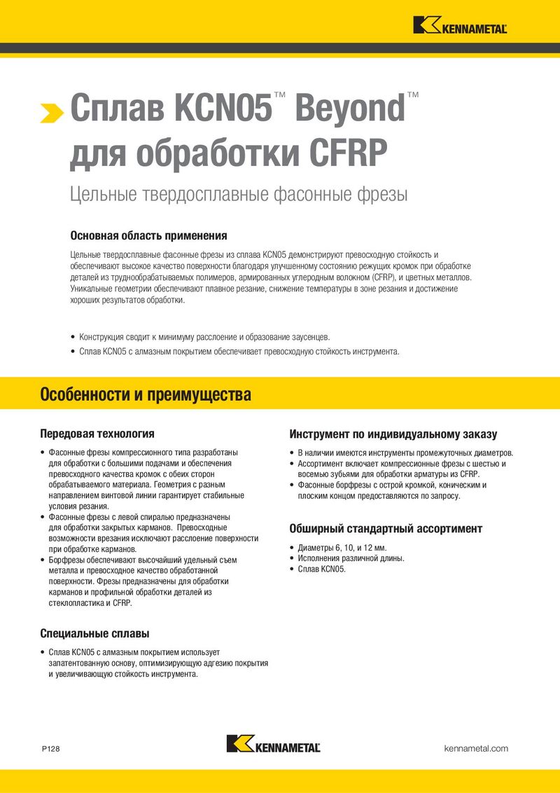 Сплав KCN05™ Beyond™ для обработки CFRP Цельные твердосплавные фасонные фрезы Основная область применения Цельные твердосплавные фасонные фрезы из сплава KCN05 демонстрируют превосходную стойкость и обеспечивают высокое качество поверхности благодаря улучшенному состоянию режущих кромок при обработке деталей из труднообрабатываемых полимеров, армированных углеродным волокном (CFRP), и цветных металлов. Уникальные геометрии обеспечивают плавное резание, снижение температуры в зоне резания и достижение хороших результатов обработки. • Конструкция сводит к минимуму расслоение и образование заусенцев. • Сплав KCN05 с алмазным покрытием обеспечивает превосходную стойкость инструмента. Особенности и преимущества Передовая технология Инструмент по индивидуальному заказу • Фасонные фрезы компрессионного типа разработаны • В наличии имеются инструменты промежуточных диаметров. для обработки с большими подачами и обеспечения • Ассортимент включает компрессионные фрезы с шестью и превосходного качества кромок с обеих сторон восемью зубьями для обработки арматуры из CFRP. обрабатываемого материала. Геометрия с разным • Фасонные борфрезы с острой кромкой, коническим и направлением винтовой линии гарантирует стабильные плоским концом предоставляются по запросу. условия резания. • Фасонные фрезы с левой спиралью предназначены для обработки закрытых карманов. Превосходные Обширный стандартный ассортимент возможности врезания исключают расслоение поверхности при обработке карманов. • Диаметры 6, 10, и 12 мм. • Борфрезы обеспечивают высочайший удельный съем • Исполнения различной длины. металла и превосходное качество обработанной • Сплав KCN05. поверхности. Фрезы предназначены для обработки карманов и профильной обработки деталей из стеклопластика и CFRP. Специальные сплавы • Сплав KCN05 с алмазным покрытием использует запатентованную основу, оптимизирующую адгезию покрытия и увеличивающую стойкость инструмента. P128 kennametal.com