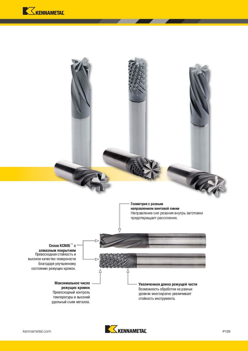 Геометрия с разным направлением винтовой линии Направление сил резания внутрь заготовки предотвращает расслоение. Сплав KCN05™ с алмазным покрытием Превосходная стойкость и высокое качество поверхности благодаря улучшенному состоянию режущих кромок. Максимальное число Увеличенная длина режущей части режущих кромок Возможность обработки на разных Превосходный контроль уровнях многократно увеличивает температуры и высокий стойкость инструмента. удельный съем металла. kennametal.com P129