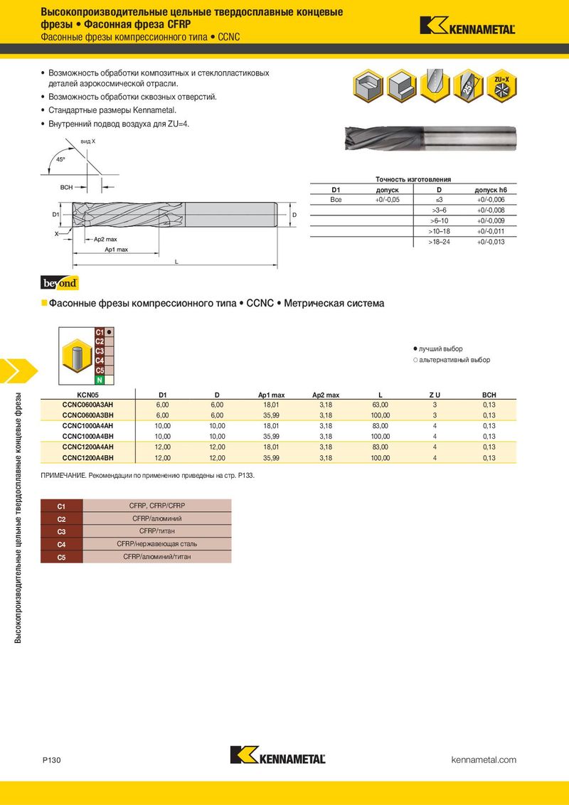 Высокопроизводительные цельные твердосплавные концевые фрезы • Фасонная фреза CFRP Фасонные фрезы компрессионного типа • CCNC • Возможность обработки композитных и стеклопластиковых деталей аэрокосмической отрасли. • Возможность обработки сквозных отверстий. • Стандартные размеры Kennametal. • Внутренний подвод воздуха для ZU=4. вид X Tочность изготовления D1 допуск D допуск h6 Bce +0/-0,05 )3 +0/-0,006 >3–6 +0/-0,008 >6–10 +0/-0,009 >10–18 +0/-0,011 >18–24 +0/-0,013 Фасонные фрезы компрессионного типа • CCNC • Метрическая система C1 ⅷ лучший выбор ࠗ альтернативный выбор C5 Высокопроизводительные цельные твердосплавные концевые фрезы KCN05 D1 D Ap1 max Ap2 max L ZU BCH CCNC0600A3AH 6,00 6,00 18,01 3,18 63,00 3 0,13 CCNC0600A3BH 6,00 6,00 35,99 3,18 100,00 3 0,13 CCNC1000A4AH 10,00 10,00 18,01 3,18 83,00 4 0,13 CCNC1000A4BH 10,00 10,00 35,99 3,18 100,00 4 0,13 CCNC1200A4AH 12,00 12,00 18,01 3,18 83,00 4 0,13 CCNC1200A4BH 12,00 12,00 35,99 3,18 100,00 4 0,13 ПРИМЕЧАНИЕ. Рекомендации по применению приведены на стр. P133. C1 CFRP, CFRP/CFRP C2 CFRP/алюминий C3 CFRP/титан C4 CFRP/нержавеющая сталь C5 CFRP/алюминий/титан P130 kennametal.com