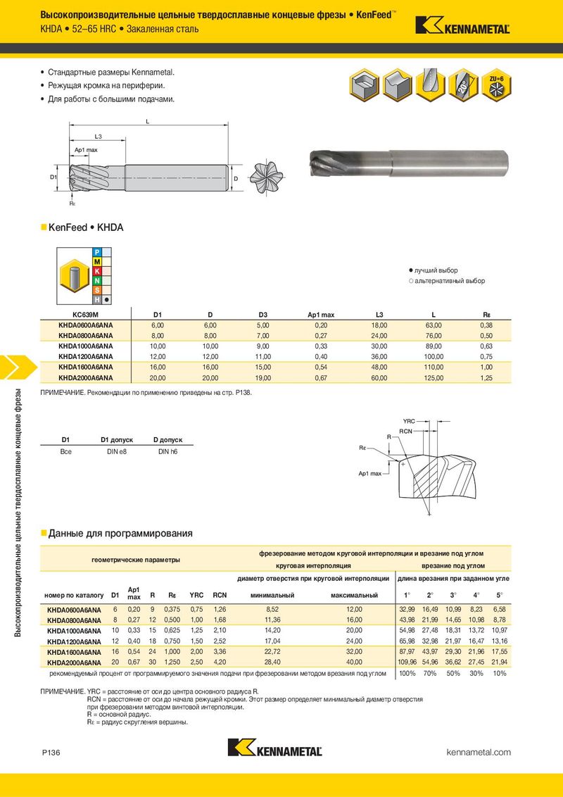 Высокопроизводительные цельные твердосплавные концевые фрезы • KenFeed™ KHDA • 52–65 HRC • Закаленная сталь • Стандартные размеры Kennametal. • Режущая кромка на периферии. • Для работы с большими подачами. 3 Rε KenFeed • KHDA ⅷ лучший выбор ࠗ альтернативный выбор KC639M D1 D D3 Ap1 max L3 L R¡ KHDA0600A6ANA 6,00 6,00 5,00 0,20 18,00 63,00 0,38 KHDA0800A6ANA 8,00 8,00 7,00 0,27 24,00 76,00 0,50 KHDA1000A6ANA 10,00 10,00 9,00 0,33 30,00 89,00 0,63 KHDA1200A6ANA 12,00 12,00 11,00 0,40 36,00 100,00 0,75 KHDA1600A6ANA 16,00 16,00 15,00 0,54 48,00 110,00 1,00 KHDA2000A6ANA 20,00 20,00 19,00 0,67 60,00 125,00 1,25 Высокопроизводительные цельные твердосплавные концевые фрезы ПРИМЕЧАНИЕ. Рекомендации по применению приведены на стр. P138. D1 D1 допуск D допуск Bce DIN e8 DIN h6 Данные для программирования фрезерование методом круговой интерполяции и врезание под углом геометрические параметры круговая интерполяция врезание под углом диаметр отверстия при круговой интерполяции длина врезания при заданном угле номер по каталогу D1 Ap1 R R¡ YRC RCN минимальный максимальный 1° 2° 3° 4° 5° max KHDA0600A6ANA 6 0,20 9 0,375 0,75 1,26 8,52 12,00 32,99 16,49 10,99 8,23 6,58 KHDA0800A6ANA 8 0,27 12 0,500 1,00 1,68 11,36 16,00 43,98 21,99 14,65 10,98 8,78 KHDA1000A6ANA 10 0,33 15 0,625 1,25 2,10 14,20 20,00 54,98 27,48 18,31 13,72 10,97 KHDA1200A6ANA 12 0,40 18 0,750 1,50 2,52 17,04 24,00 65,98 32,98 21,97 16,47 13,16 KHDA1600A6ANA 16 0,54 24 1,000 2,00 3,36 22,72 32,00 87,97 43,97 29,30 21,96 17,55 KHDA2000A6ANA 20 0,67 30 1,250 2,50 4,20 28,40 40,00 109,96 54,96 36,62 27,45 21,94 рекомендуемый процент от программируемого значения подачи при фрезеровании методом врезания под углом 100% 70% 50% 30% 10% ПРИМЕЧАНИЕ. YRC = расстояние от оси до центра основного радиуса R. RCN = расстояние от оси до начала режущей кромки. Этот размер определяет минимальный диаметр отверстия при фрезеровании методом винтовой интерполяции. R = основной радиус. R¡ = радиус cкругления вершины. P136 kennametal.com