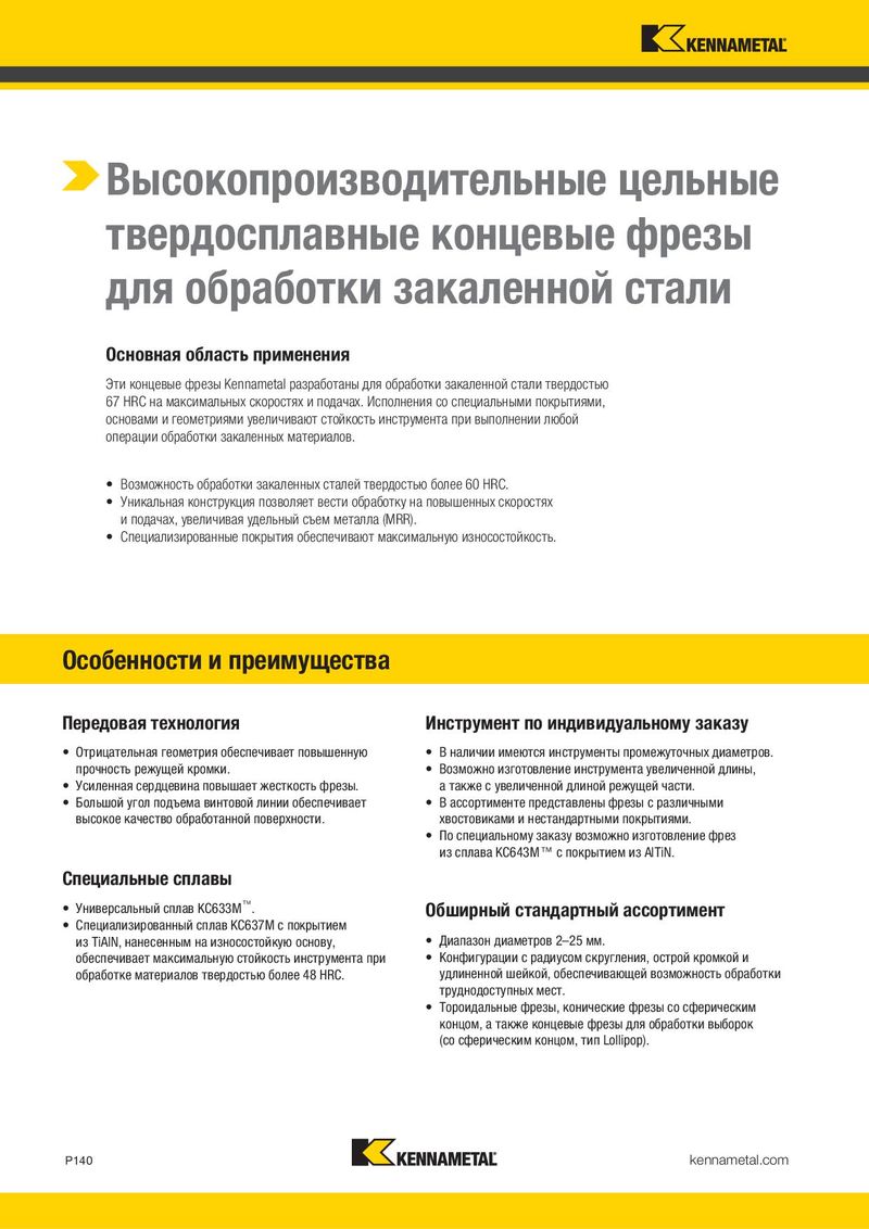 Высокопроизводительные цельные твердосплавные концевые фрезы для обработки закаленной стали Основная область применения Эти концевые фрезы Kennametal разработаны для обработки закаленной стали твердостью 67 HRC на максимальных скоростях и подачах. Исполнения со специальными покрытиями, основами и геометриями увеличивают стойкость инструмента при выполнении любой операции обработки закаленных материалов. • Возможность обработки закаленных сталей твердостью более 60 HRC. • Уникальная конструкция позволяет вести обработку на повышенных скоростях и подачах, увеличивая удельный съем металла (MRR). • Специализированные покрытия обеспечивают максимальную износостойкость. Особенности и преимущества Передовая технология Инструмент по индивидуальному заказу • Отрицательная геометрия обеспечивает повышенную • В наличии имеются инструменты промежуточных диаметров. прочность режущей кромки. • Возможно изготовление инструмента увеличенной длины, • Усиленная сердцевина повышает жесткость фрезы. а также с увеличенной длиной режущей части. • Большой угол подъема винтовой линии обеспечивает • В ассортименте представлены фрезы с различными высокое качество обработанной поверхности. хвостовиками и нестандартными покрытиями. • По специальному заказу возможно изготовление фрез из сплава KC643M™ с покрытием из AlTiN. Специальные сплавы • Универсальный сплав KC633M™. Обширный стандартный ассортимент • Специализированный сплав KC637M с покрытием из TiAlN, нанесенным на износостойкую основу, • Диапазон диаметров 2–25 мм. обеспечивает максимальную стойкость инструмента при • Конфигурации с радиусом скругления, острой кромкой и обработке материалов твердостью более 48 HRC. удлиненной шейкой, обеспечивающей возможность обработки труднодоступных мест. • Тороидальные фрезы, конические фрезы со сферическим концом, а также концевые фрезы для обработки выборок (со сферическим концом, тип Lollipop). P140 kennametal.com