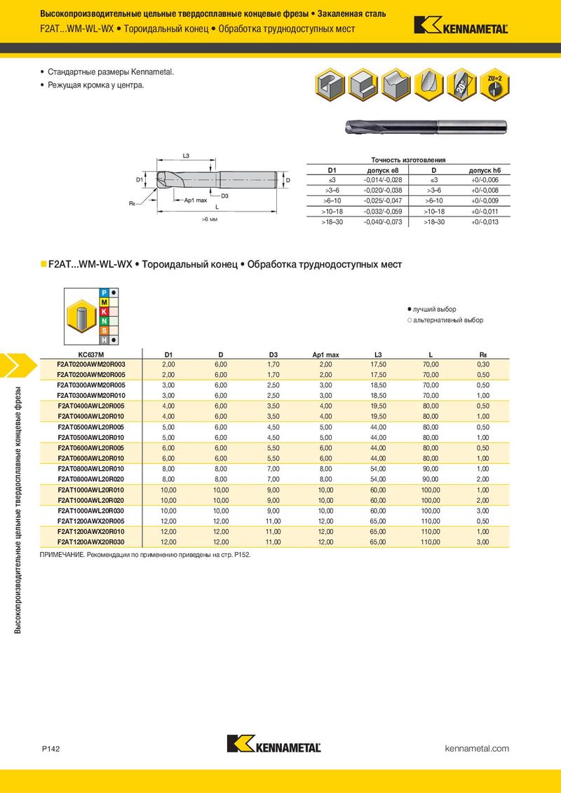 Высокопроизводительные цельные твердосплавные концевые фрезы • Закаленная сталь F2AT...WM-WL-WX • Тороидальный конец • Обработка труднодоступных мест • Стандартные размеры Kennametal. • Режущая кромка у центра. Tочность изготовления D1 допуск e8 D допуск h6 )3 -0,014/-0,028 )3 +0/-0,006 >3–6 -0,020/-0,038 >3–6 +0/-0,008 >6–10 -0,025/-0,047 >6–10 +0/-0,009 >10–18 -0,032/-0,059 >10–18 +0/-0,011 >6 мм >18–30 -0,040/-0,073 >18–30 +0/-0,013  F2AT...WM-WL-WX • Тороидальный конец • Обработка труднодоступных мест ⅷ лучший выбор ࠗ альтернативный выбор KC637M D1 D D3 Ap1 max L3 L R¡ F2AT0200AWM20R003 2,00 6,00 1,70 2,00 17,50 70,00 0,30 F2AT0200AWM20R005 2,00 6,00 1,70 2,00 17,50 70,00 0,50 Высокопроизводительные цельные твердосплавные концевые фрезы F2AT0300AWM20R005 3,00 6,00 2,50 3,00 18,50 70,00 0,50 F2AT0300AWM20R010 3,00 6,00 2,50 3,00 18,50 70,00 1,00 F2AT0400AWL20R005 4,00 6,00 3,50 4,00 19,50 80,00 0,50 F2AT0400AWL20R010 4,00 6,00 3,50 4,00 19,50 80,00 1,00 F2AT0500AWL20R005 5,00 6,00 4,50 5,00 44,00 80,00 0,50 F2AT0500AWL20R010 5,00 6,00 4,50 5,00 44,00 80,00 1,00 F2AT0600AWL20R005 6,00 6,00 5,50 6,00 44,00 80,00 0,50 F2AT0600AWL20R010 6,00 6,00 5,50 6,00 44,00 80,00 1,00 F2AT0800AWL20R010 8,00 8,00 7,00 8,00 54,00 90,00 1,00 F2AT0800AWL20R020 8,00 8,00 7,00 8,00 54,00 90,00 2,00 F2AT1000AWL20R010 10,00 10,00 9,00 10,00 60,00 100,00 1,00 F2AT1000AWL20R020 10,00 10,00 9,00 10,00 60,00 100,00 2,00 F2AT1000AWL20R030 10,00 10,00 9,00 10,00 60,00 100,00 3,00 F2AT1200AWX20R005 12,00 12,00 11,00 12,00 65,00 110,00 0,50 F2AT1200AWX20R010 12,00 12,00 11,00 12,00 65,00 110,00 1,00 F2AT1200AWX20R030 12,00 12,00 11,00 12,00 65,00 110,00 3,00 ПРИМЕЧАНИЕ. Рекомендации по применению приведены на стр. P152. P142 kennametal.com