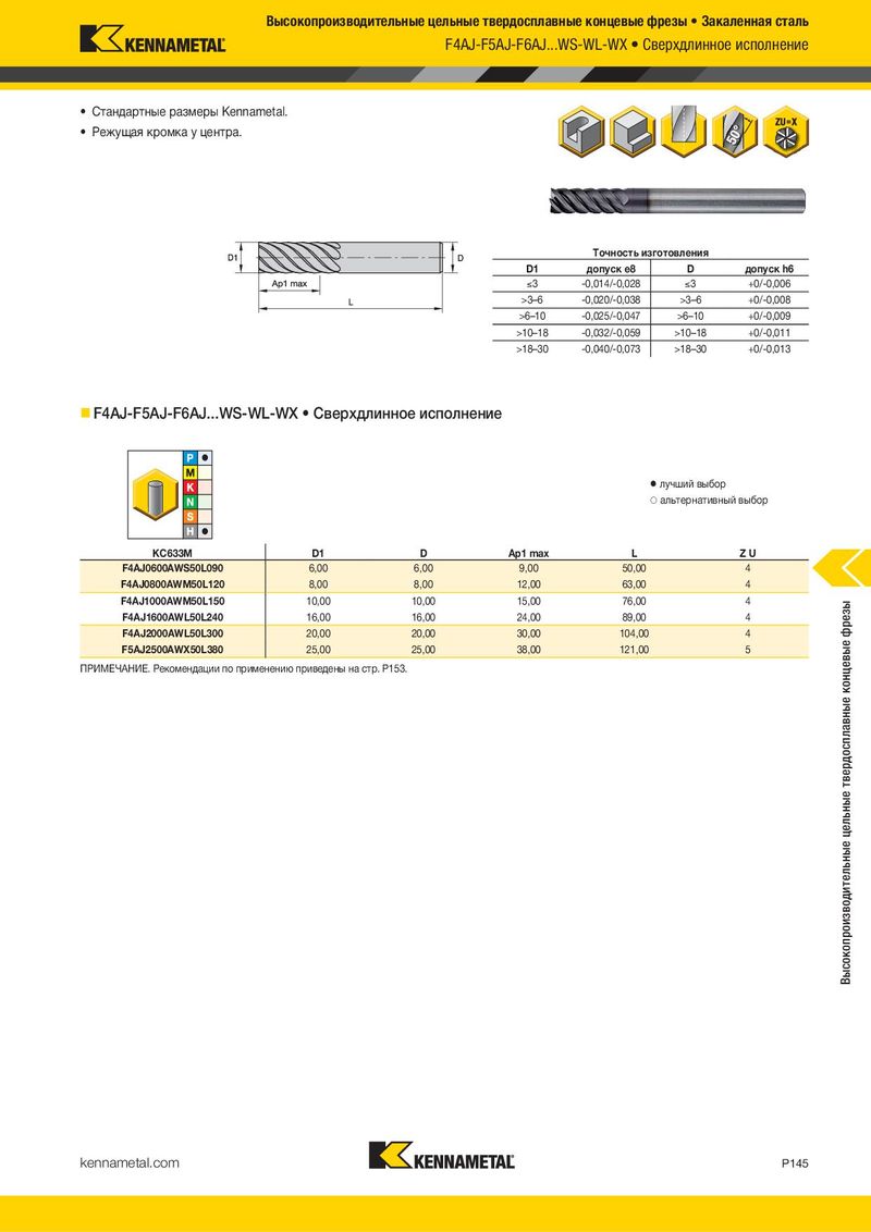 Высокопроизводительные цельные твердосплавные концевые фрезы • Закаленная сталь F4AJ-F5AJ-F6AJ...WS-WL-WX • Сверхдлинное исполнение • Стандартные размеры Kennametal. • Режущая кромка у центра. Tочность изготовления D1 допуск e8 D допуск h6 )3 -0,014/-0,028 )3 +0/-0,006 >3–6 -0,020/-0,038 >3–6 +0/-0,008 >6–10 -0,025/-0,047 >6–10 +0/-0,009 >10–18 -0,032/-0,059 >10–18 +0/-0,011 >18–30 -0,040/-0,073 >18–30 +0/-0,013 F4AJ-F5AJ-F6AJ...WS-WL-WX • Сверхдлинное исполнение ⅷ лучший выбор ࠗ альтернативный выбор KC633M D1 D Ap1 max L ZU F4AJ0600AWS50L090 6,00 6,00 9,00 50,00 4 F4AJ0800AWM50L120 8,00 8,00 12,00 63,00 4 F4AJ1000AWM50L150 10,00 10,00 15,00 76,00 4 Высокопроизводительные цельные твердосплавные концевые фрезы F4AJ1600AWL50L240 16,00 16,00 24,00 89,00 4 F4AJ2000AWL50L300 20,00 20,00 30,00 104,00 4 F5AJ2500AWX50L380 25,00 25,00 38,00 121,00 5 ПРИМЕЧАНИЕ. Рекомендации по применению приведены на стр. P153. kennametal.com P145