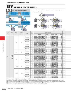 GROOVING / CUTTING OFF WFHFHF CW HH HFHF B HH GROOVING / CUTTING OFF GYSERIES (EXTERNAL) 1-2 00° type holder (Metric) Note 1) For modular blades and holders, please order separately.Note 2) Please use right hand modular blade for right hand holder and left hand modular Insert GY2Mooooooooo--G GSM Insert GY2Gooooooooo-MFInsertGY22M G ooooooooo--G GULInsertGY2Mooooooooo-MSblade for left hand holder.CDX Insert GY11M G ooooooooo--G GFMGS Insert GY2Mooooooooo-MM LF LH LH Fig. 1 CUTDIA Fig. 2 CUTDIA Insert GY2Mooooooooo-BM Insert GY2Mooooooooo--G GSM LH 2 LH 2 Insert GY22M G ooooooooo--G GUL LH LH Insert GY2MoooooR/Loo-GM Fig. 5 CUTDIA Fig. 6 CUTDIA LH 2 LH 2 Right hand tool holder shown. Seat CW CDX CUTDIASize(mm)(mm)(mm)Type Hand(R/L) Order Number Fig.HolderStockModular BladeStock F Modular R GYHR1616J00-M20R aLGYHL1616J00-M20LaGYM20RA-E06 a 3GYM20LA-E06a3ModularRGYHR2020K00-M20RaLGYHL2020K00-M20LaGYM20RA-E06a1GYM20LA-E06a1 6 12 Modular R GYHR2020K00-M25R aLGYHL2020K00-M25LaModularRGYHR2525M00-M25RaLGYHL2525M00-M25LaGYM25RA-E06a3GYM25LA-E06a3GYM25RA-E06a1GYM25LA-E06a1 Modular R GYHR3225P00-M25R sLGYHL3225P00-M25LsGYM25RA-E06 a 5GYM25LA-E06a5 Modular R GYHR3232P00-M25R sLGYHL3232P00-M25LsGYM25RA-E06 a 5GYM25LA-E06a5 10 20 Modular R GYHR1616J00-M20R aLGYHL1616J00-M20LaModularRGYHR2020K00-M20RaLGYHL2020K00-M20LaGYM20RA-E10a3GYM20LA-E10a3GYM20RA-E10a1GYM20LA-E10a1 2.39E2.502.7412 Modular R GYHR2020K00-M25R aLGYHL2020K00-M25LaGYM25RA-E12 a 3GYM25LA-E12a324ModularRGYHR2525M00-M25RaLGYHL2525M00-M25LaModularRGYHR3225P00-M25RsLGYHL3225P00-M25LsGYM25RA-E12a1GYM25LA-E12a1GYM25RA-E12a5GYM25LA-E12a5 Modular R GYHR3232P00-M25R sLGYHL3232P00-M25LsGYM25RA-E12 a 5GYM25LA-E12a5 18 *4 36 Modular R GYHR1616J00-M20R aLGYHL1616J00-M20LaModularRGYHR2020K00-M20RaLGYHL2020K00-M20LaGYM20RB-E18a4GYM20LB-E18a4GYM20RB-E18a2GYM20LB-E18a2 Modular R GYHR2020K00-M25R aLGYHL2020K00-M25LaGYM25RA-E20 a 4GYM25LA-E20a4 Modular20 *140 *2ModularRGYHR2525M00-M25R aLGYHL2525M00-M25LaRGYHR3225P00-M25RsLGYHL3225P00-M25LsGYM25RA-E20a2GYM25LA-E20a2GYM25RA-E20a6GYM25LA-E20a6 Modular R GYHR3232P00-M25R sLGYHL3232P00-M25LsGYM25RA-E20 a 6GYM25LA-E20a6 CW = Cutting Width CDX = Max. Groove Depth CUTDIA = Max. Cut Off Diameter ****1234 The maximum groove depth (CDX) varies according to the insert used. Please refer to the maximum groove depth (CDX) of inserts on pages F011 to F015. The maximum cut off diameter (CUTDIA) varies according to the insert used. The cut off diameter is double the maximum groove depth (CDX) of inserts on pages F011 to F015. Dimensions shown are when the gauge insert is used. If other insert geometries are used then LF, LH and LH 2 values may vary. The maximum groove depth (CDX) is limited by the workpiece diameter. For details, please refer to page F208. a : USA Stock s : Stocked in Japan F066
