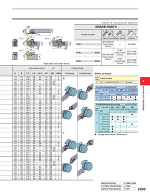 WFHFHF CW HBHH H HF B HBH H GROOVING / CUTTING OFF * Wrench : z : Clamp Screw, x : Blade Screw CDX SPARE PARTS z z LF Holder Number x 5 pcs. x LH LHFig. 3CUTDIAFig. 4CUTDIA Clamp Screw Blade Screw Wrench *zHSC05030 GYQR/Looooooo-ooo (Clamp Torque ─ HKY40R LH 2 LH 2 : 62 lbf-in) Fig. 7 LHCUTDIA GYHR/Looooooo-M20R/L TS407(Clamp TorquexGY06013M: 31 lbf-in)zTKY30RxTKY15D (Clamp Torque Right hand tool holder shown. GYHR/Looooooo-M25R/L : 53 lbf-in) TS55(Clamp Torque: 44 lbf-in)zTKY30RxTKY25D Dimensions (mm) *3 Cutting Mode H B LF LH LH 2 HF WF HBH Clockwise Anticlockwise Select an Insert 16 16 104 28 44 16 2016161042844162044R202012536─2020.30─ SeatSizeInsert NumberFGYoo0300/0318/0324Foooo−Breaker F 20 20 125 36 ─ 20 20.30 ─ 20 20 119 28 43 20 23 ─ For Grooving/Cutting off F011, F012 20 20 119 28 43 20 23 ─20201173152202652020117315220265 SeatSize Breaker GU GS GM GL 05-GM GFGS(Gummy Steel) (Low) (Medium) (AluminumAloy) (Cutting off) (Hardenedsteel)CWNeutralHand Neutral 25 25 150 36 ─ 25 25.30 ─252515036─2525.30─ F .118", 3.00 mm.125", 3.18 mmaaaa aa a a aa 25 25 142 31 49 25 28 ─ 25 25 142 31 49 25 28 ─322516231493228─ For Multifunctional Grooving F013, F014 32 25 162 31 49 32 28 ─323216231493235─323216231493235─ SeatSize Breaker MF MS MM BM(Finish)(Low)(Medium) (Copying, Recessing)CWBall nose 16 16 110 34 50 16 20 4 .118", 3.00 mm a 16 16 110 34 50 16 20 4 RE 0.2 mm a a a 20 20 125 34 49 20 23 ─ RE 0.4 mm a a a 20 20 125 34 49 20 23 ─2020125396020265 F RE 0.8 mm.125", 3.18 mm a a 20 20 125 39 60 20 26 5 RE 0.2 mm a 25 25 150 39 57 25 28 ─ RE 0.4 mm a 25 25 150 39 57 25 28322517039573228──L .128", 3.24 mm aa : Gauge insert shown dimensions 32 25 170 39 57 32 28 ─ 32 32 170 39 57 32 35 ─ 32 32 170 39 57 32 35 ─ 16 16 116 40 56 16 20 4 16 16 116 40 56 16 20 4 20 20 125 39 ─ 20 20.25 ─ 20 20 125 39 ─ 20 20.25 ─ 20 20 131 40 55 20 23 ─ 20 20 131 40 55 20 23 ─ 20 20 131 45 66 20 26 5 20 20 131 45 66 20 26 5 25 25 150 41 ─ 25 25.25 ─ 25 25 150 41 ─ 25 25.25 ─ 25 25 156 45 63 25 28 ─ 25 25 156 45 63 25 28 ─ 32 25 176 45 63 32 28 ─ 32 25 176 45 63 32 28 ─ 32 32 176 45 63 32 35 ─ 32 32 176 45 63 32 35 ─ IDENTIFICATION F008, F009 CUTTING CONDITIONS F206 INSTRUCTION MANUAL F211 F069