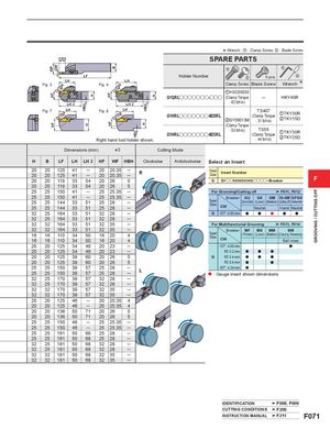 WFHFHF CW HBHH H HFHF B HBH HBHH H GROOVING / CUTTING OFF * Wrench : z : Clamp Screw, x : Blade Screw CDX SPARE PARTS z z LF Holder Number x 5 pcs. x LH LHFig. 3CUTDIAFig. 4CUTDIA Clamp Screw Blade Screw Wrench *zHSC05030 GYQR/Looooooo-ooo (Clamp Torque ─ HKY40R LH 2 LH 2 : 62 lbf-in) Fig. 7 LHCUTDIA Fig. 8 LHCUTDIA GYHR/Looooooo-M20R/L TS407(Clamp TorquexGY06013M: 31 lbf-in)zTKY30RxTKY15D (Clamp Torque Right hand tool holder shown. GYHR/Looooooo-M25R/L : 53 lbf-in) TS55(Clamp Torque: 44 lbf-in)zTKY30RxTKY25D Dimensions (mm) *3 Cutting Mode H B LF LH LH 2 HF WF HBH Clockwise Anticlockwise Select an Insert 2020 20 125 412012541── 20 20.35 ─2020.35─R2020119335420265 SeatSizeInsert NumberGGYoo0400/0424Goooo−Breaker F 20 20 119 33 54 20 26 5 25 25 150 41 ─ 25 25.35 ─ For Grooving/Cutting off F011, F012 25 25 150 41 ─ 25 25.35 ─252514433512528─252514433512528─ SeatSize Breaker GU GS GM 05-GM GFGS(Gummy Steel)(Low)(Medium)(Cutting off)(Hardened steel)CWNeutralHandNeutral 32 25 164 33 51 32 28 ─ G .157", 4.00 mm a a a a a 32 25 164 33 51 32 28 ─ 32 32 164 33 51 32 35 ─ For Multifunctional Grooving F013, F014 32 32 164 33 51 32 35 ─16161103450162041616110345016204 SeatSize Breaker MF MS MM BM(Finish)(Low)(Medium) (Copying, Recessing)CWBall nose 20 20 125 34 49 20 23 ─ .157", 4.00 mm a 20 20 125 34 49 20 23 ─ RE 0.2 mm a a a 20 20 125 39 60 20 26 5 G RE 0.4 mm a a a 20 20 125 39 60 20 26 5 RE 0.8 mm a a 25 25 150 39 57 25 28252515039572528── L .167", 4.24 mm aa : Gauge insert shown dimensions 32 25 170 39 57 32 28 ─ 32 25 170 39 57 32 28 ─ 32 32 170 39 57 32 35 ─ 32 32 170 39 57 32 35 ─ 20 20 125 46 ─ 20 20.35 4 20 20 125 46 ─ 20 20.35 4 20 20 136 50 71 20 26 5 20 20 136 50 71 20 26 5 25 25 150 46 ─ 25 25.35 ─ 25 25 150 46 ─ 25 25.35 ─ 25 25 161 50 68 25 28 ─ 25 25 161 50 68 25 28 ─ 32 25 181 50 68 32 28 ─ 32 25 181 50 68 32 28 ─ 32 32 181 50 68 32 35 ─ 32 32 181 50 68 32 35 ─ IDENTIFICATION F008, F009 CUTTING CONDITIONS F206 INSTRUCTION MANUAL F211 F071