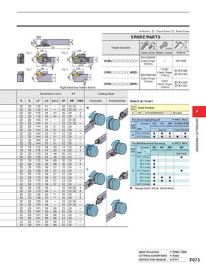 WFHFHF CW HBHH H HFHF B HBH HBHH H GROOVING / CUTTING OFF * Wrench : z : Clamp Screw, x : Blade Screw CDX SPARE PARTS z z LF Holder Number x 5 pcs. x LH LHFig. 3CUTDIAFig. 4CUTDIA Clamp Screw Blade Screw Wrench *zHSC05030 GYQR/Looooooo-ooo (Clamp Torque ─ HKY40R LH 2 LH 2 : 62 lbf-in) Fig. 7 LHCUTDIA Fig. 8 LHCUTDIA GYHR/Looooooo-M20R/L TS407(Clamp TorquexGY06013M: 31 lbf-in)zTKY30RxTKY15D (Clamp Torque Right hand tool holder shown. GYHR/Looooooo-M25R/L : 53 lbf-in) TS55(Clamp Torque: 44 lbf-in)zTKY30RxTKY25D Dimensions (mm) *3 Cutting Mode H B LF LH LH 2 HF WF HBH Clockwise Anticlockwise Select an Insert 2020 20 125 412012541── 20 20.35 ─2020.35─R2020119335420265 SeatSizeInsert NumberHGYoo0475/0500/0524Hoooo−Breaker F 20 20 119 33 54 20 26 5 25 25 150 41 ─ 25 25.35 ─ For Grooving/Cutting off F011, F012 25 25 150 41 ─ 25 25.35 ─252514433512528─252514433512528─ SeatSize Breaker GU GS GM 05-GM GFGS(Gummy Steel)(Low)(Medium)(Cutting off)(Hardened steel)CWNeutralHandNeutral 32 25 164 33 51 32 28 ─322516433513228─ H .187", 4.75 mm.197", 5.00 mmaa aa aa a aa 32 32 164 33 51 32 35 ─ 32 32 164 33 51 32 35 ─ For Multifunctional Grooving F013, F014 16 16 110 34 50 16 20 41616110345016204202012534492023─ SeatSize Breaker MF MS MM BM(Finish)(Low)(Medium) (Copying, Recessing)CWBall nose 20 20 125 34 49 20 23 ─ .187", 4.75 mm a 20 20 125 39 60 20 26 5 RE 0.2 mm a 20 20 125 39 60 20 26 5 RE 0.4 mm a 25 25 150 39 57 25 28252515039572528── L RE 0.8 mm aH.197", 5.00 mm a 32 25 170 39 57 32 28 ─ RE 0.2 mm a 32 25 170 39 57 32 28 ─ RE 0.4 mm a a a 32 32 170 39 57 32 35 ─ RE 0.8 mm a a a 32 32 170 39 57 32 35 ─ .206", 5.24 mm a 20 20 125 46 ─ 20 20.35 4 a : Gauge insert shown dimensions 20 20 125 46 ─ 20 20.35 4 20 20 136 50 71 20 26 5 20 20 136 50 71 20 26 5 25 25 150 46 ─ 25 25.35 ─ 25 25 150 46 ─ 25 25.35 ─ 25 25 161 50 68 25 28 ─ 25 25 161 50 68 25 28 ─ 32 25 181 50 68 32 28 ─ 32 25 181 50 68 32 28 ─ 32 32 181 50 68 32 35 ─ 32 32 181 50 68 32 35 ─ IDENTIFICATION F008, F009 CUTTING CONDITIONS F206 INSTRUCTION MANUAL F211 F073