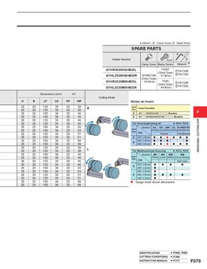 GROOVING / CUTTING OFF * Wrench : z : Clamp Screw, x : Blade Screw SPARE PARTS z Holder Number 5 pcs. x Clamp Screw Blade Screw Wrench * GYHR2020K90-M20LGYHL2020K90-M20R TS407(Clamp TorqueGY06013M: 31 lbf-in)zTKY30RxTKY15D (Clamp Torque GYHR2525M90-M25LGYHL2525M90-M25R : 53 lbf-in) TS55(Clamp Torque: 44 lbf-in)zTKY30RxTKY25D Dimensions (mm) *3 Cutting Mode H B LF LH HF WF Select an Insert 2020 20 125 3520125352020 3939 R2525150382545 SeatSizeInsert NumberDGYoo0200/0224Doooo−Breaker F 25 25 150 38 25 45 E GYoo0239/0250/0274Eoooo−Breaker 20 20 125 35 20 45 20 20 125 35 20 45 For Grooving/Cutting off F011, F012 25 25 150 38 25 5325251503825532020125352051 SeatSize Breaker GU GS GM GL 05-GM GFGS(Gummy Steel) (Low) (Medium) (AluminumAloy) (Cutting off) (Hardenedsteel)CWNeutralHand Neutral 20 20 125 35 20 51 D .079", 2.00 mm a a a a a a 25 25 150 38 25 592525150382559 E .094", 2.39 mm.098", 2.50 mm aa aa aa a a aa 2020 20 125 3520125352020 3939 L For Multifunctional Grooving F013, F014 25 25 150 38 25 4525251503825452020125352045 SeatSize Breaker MF MS MM BM(Finish)(Low)(Medium) (Copying, Recessing)CWBall nose 20 20 125 35 20 452525150382553 D .079", 2.00 mm.088", 2.24 mm aa a a a 25 25 150 38 25 53 .094", 2.39 mm a 20 20 125 35 20 51 E .098", 2.50 mm a a a a 20 20 125 35 20 51 .108", 2.74 mm a 25 25 150 38 25 59 a : Gauge insert shown dimensions 25 25 150 38 25 59 IDENTIFICATION F008, F009 CUTTING CONDITIONS F206 INSTRUCTION MANUAL F211 F079