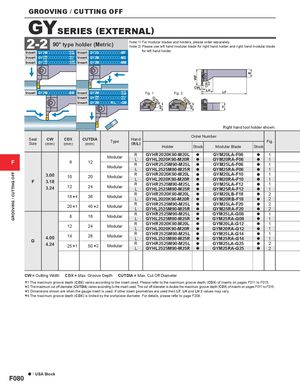 GROOVING / CUTTING OFF HF HF WF CDX H B GROOVING / CUTTING OFF GYSERIES (EXTERNAL) 2-2 90° type holder (Metric) Note 1) For modular blades and holders, please order separately.Note 2) Please use left hand modular blade for right hand holder and right hand modular blade Insert GY2Mooooooooo--G GSM Insert GY2Gooooooooo-MF for left hand holder. Insert GY22M G ooooooooo--G GUL Insert GY2Mooooooooo-MS Insert GY11M G ooooooooo--G GFMGS Insert GY2Mooooooooo-MM CW Insert GY2Mooooooooo-BM Insert GY2Mooooooooo--G GSM Fig. 1 Fig. 2 LH LF Insert GY22M G ooooooooo--G GULInsertGY2MoooooR/Loo-GMCUTDIA CUTDIA Right hand tool holder shown. Seat CW CDX CUTDIASize(mm)(mm)(mm)Type Hand(R/L) Order Number Fig.HolderStockModular BladeStock F 6 12 Modular R GYHR2020K90-M20L aLGYHL2020K90-M20RaGYM20LA-F06GYM20RA-F06a 1a1ModularRGYHR2525M90-M25LaLGYHL2525M90-M25RaGYM25LA-F06GYM25RA-F06a1a1 3.00 10F3.183.2412 20 Modular R GYHR2020K90-M20L aLGYHL2020K90-M20RaGYM20LA-F10GYM20RA-F10a 1a124ModularRGYHR2525M90-M25LaLGYHL2525M90-M25RaGYM25LA-F12GYM25RA-F12a1a1 18 *4 36 Modular R GYHR2020K90-M20L aLGYHL2020K90-M20RaGYM20LB-F18GYM20RB-F18a 2a2 20 *1 40 *2 Modular R GYHR2525M90-M25L aLGYHL2525M90-M25RaGYM25LA-F20GYM25RA-F20a 2a2 8 16 Modular R GYHR2525M90-M25L aLGYHL2525M90-M25RaGYM25LA-G08GYM25RA-G08a 1a1 12 24 Modular R GYHR2020K90-M20L aLGYHL2020K90-M20RaGYM20LA-G12GYM20RA-G12a 1a1 G 4.004.24 14 28 Modular R GYHR2525M90-M25L aLGYHL2525M90-M25Ra25 *150 *2ModularRGYHR2525M90-M25LaLGYHL2525M90-M25RaGYM25LA-G14GYM25RA-G14GYM25LA-G25GYM25RA-G25a1a1a2a2 CW = Cutting Width CDX = Max. Groove Depth CUTDIA = Max. Cut Off Diameter ****1234 The maximum groove depth (CDX) varies according to the insert used. Please refer to the maximum groove depth (CDX) of inserts on pages F011 to F015. The maximum cut off diameter (CUTDIA) varies according to the insert used. The cut off diameter is double the maximum groove depth (CDX) of inserts on pages F011 to F015. Dimensions shown are when the gauge insert is used. If other insert geometries are used then LF, LH and LH 2 values may vary. The maximum groove depth (CDX) is limited by the workpiece diameter. For details, please refer to page F208. a : USA Stock F080