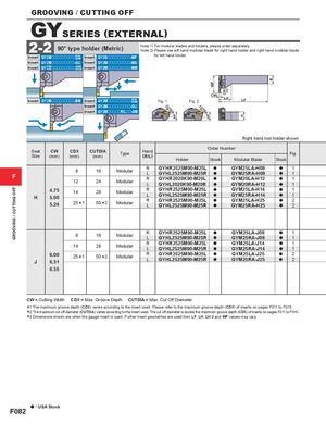 GROOVING / CUTTING OFF HF HF WF CDX H B GROOVING / CUTTING OFF GYSERIES (EXTERNAL) 2-2 90° type holder (Metric) Note 1) For modular blades and holders, please order separately.Note 2) Please use left hand modular blade for right hand holder and right hand modular blade Insert GY2Mooooooooo--G GSM Insert GY2Gooooooooo-MF for left hand holder. Insert GY2Mooooooooo-GU Insert GY2Mooooooooo-MS Insert GY11M G ooooooooo--G GFMGS Insert GY2Mooooooooo-MM CW Insert GY2Mooooooooo-BM Insert GY2Mooooooooo--G GSM Fig. 1 Fig. 2 LH LF Insert GY2Mooooooooo-GUInsertGY2MoooooR/Loo-GMCUTDIA CUTDIA Right hand tool holder shown. Seat CW CDX CUTDIASize(mm)(mm)(mm)TypeHand(R/L) Order Number Fig.HolderStockModular BladeStock F 8 16 Modular R GYHR2525M90-M25L aLGYHL2525M90-M25RaGYM25LA-H08GYM25RA-H08a 1a11224ModularRGYHR2020K90-M20LaLGYHL2020K90-M20RaGYM20LA-H12GYM20RA-H12a1a1 4.75H5.005.2414 28 Modular R GYHR2525M90-M25L aLGYHL2525M90-M25Ra25 *150 *2ModularRGYHR2525M90-M25LaLGYHL2525M90-M25RaGYM25LA-H14GYM25RA-H14GYM25LA-H25GYM25RA-H25a1a1a2a2 8 16 Modular R GYHR2525M90-M25L aLGYHL2525M90-M25RaGYM25LA-J08 a 1GYM25RA-J08a1 14 28 Modular R GYHR2525M90-M25L aLGYHL2525M90-M25RaGYM25LA-J14 a 1GYM25RA-J14a1 6.00J6.3125 *1 50 *2 Modular R GYHR2525M90-M25L aLGYHL2525M90-M25RaGYM25LA-J25GYM25RA-J25a 2a2 6.35 CW = Cutting Width CDX = Max. Groove Depth CUTDIA = Max. Cut Off Diameter ***123 The maximum groove depth (CDX) varies according to the insert used. Please refer to the maximum groove depth (CDX) of inserts on pages F011 to F015. The maximum cut off diameter (CUTDIA) varies according to the insert used. The cut off diameter is double the maximum groove depth (CDX) of inserts on pages F011 to F015. Dimensions shown are when the gauge insert is used. If other insert geometries are used then LF, LH, LH 2 and WF values may vary. a : USA Stock F082