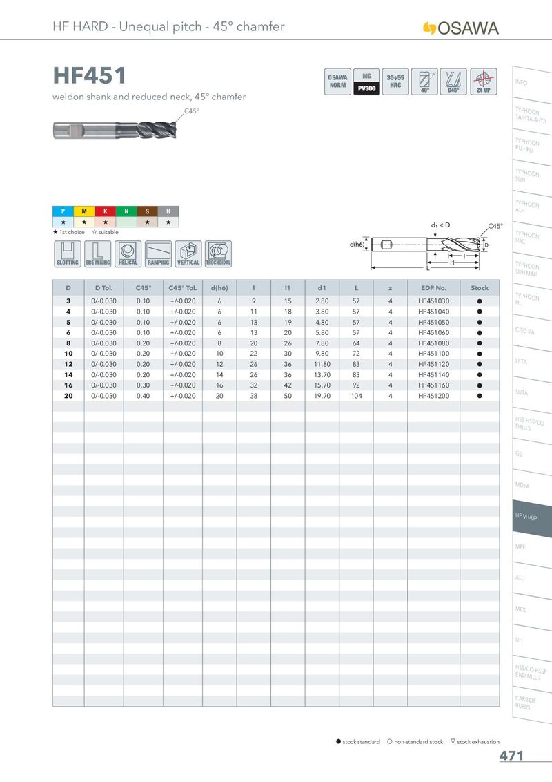 HF HARD - Unequal pitch - 45° chamfer HF451 OSAWA INFO NORM weldon shank and reduced neck, 45° chamfer C45° TTYAP-HHTOAO-4NHTA TPYUP-HHPOUON TSUYPHHOON P M K N S H TAYLPHHOON + + + + + C45° + 1st choice , suitable THYRPCHOON SLOTTING SIDE MILLING HELICAL RAMPING VERTICAL TROCHOIDAL TSUYPHHMOIONIN D D Tol. C45° C45° Tol. d(h6) l l1 d1 L z EDP No. Stock 3 0/-0.030 0.10 +/-0.020 6 9 15 2.80 57 4 HF451030 h THYLPHOON 4 0/-0.030 0.10 +/-0.020 6 11 18 3.80 57 4 HF451040 h 5 0/-0.030 0.10 +/-0.020 6 13 19 4.80 57 4 HF451050 h 6 0/-0.030 0.10 +/-0.020 6 13 20 5.80 57 4 HF451060 h C-SD-TA 8 0/-0.030 0.20 +/-0.020 8 20 26 7.80 64 4 HF451080 h 10 0/-0.030 0.20 +/-0.020 10 22 30 9.80 72 4 HF451100 h 12 0/-0.030 0.20 +/-0.020 12 26 36 11.80 83 4 HF451120 h LFTA 14 0/-0.030 0.20 +/-0.020 14 26 36 13.70 83 4 HF451140 h 16 0/-0.030 0.30 +/-0.020 16 32 42 15.70 92 4 HF451160 h 20 0/-0.030 0.40 +/-0.020 20 38 50 19.70 104 4 HF451200 h SUTA HDSRSIL-LHSSS/CO G2 MDTA HF VH/UP MEF ALU MEX UH HENSSD/CMOIL-LHSSSP CBUARRRBSIDE h stock standard f non-standard stock m stock exhaustion 471