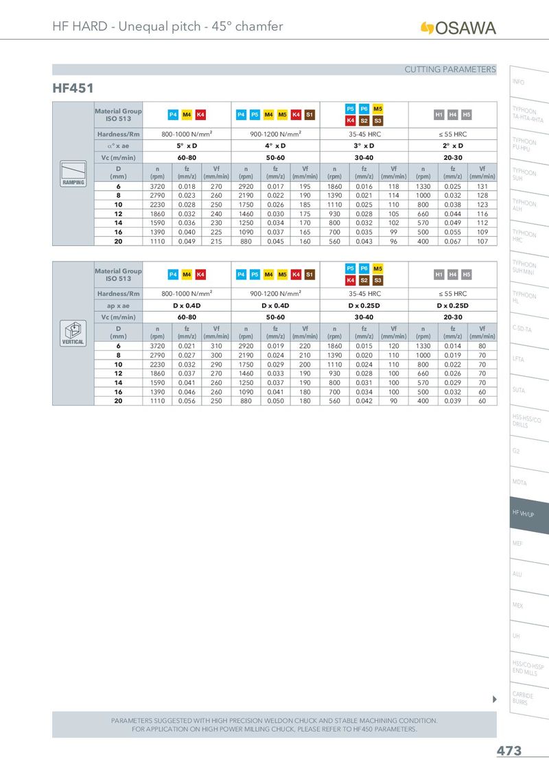 HF HARD - Unequal pitch - 45° chamfer CUTTING PARAMETERS HF451 INFO Material Group P5 P6 M5 TTYAP-HHTOAO-4NHTA ISO 513 P4 M4 K4 P4 P5 M4 M5 K4 S1 H1 H4 H5 K4 S2 S3 Hardness/Rm 800-1000 N/mm² 900-1200 N/mm² 35-45 HRC ≤ 55 HRC TPYUP-HHPOUON _° x ae 5° x D 4° x D 3° x D 2° x D Vc (m/min) 60-80 50-60 30-40 20-30 D n fz Vf n fz Vf n fz Vf n fz Vf TSUYPHHOON (mm) (rpm) (mm/z) (mm/min) (rpm) (mm/z) (mm/min) (rpm) (mm/z) (mm/min) (rpm) (mm/z) (mm/min) RAMPING 6 3720 0.018 270 2920 0.017 195 1860 0.016 118 1330 0.025 131 8 2790 0.023 260 2190 0.022 190 1390 0.021 114 1000 0.032 128 TAYLPHHOON 10 2230 0.028 250 1750 0.026 185 1110 0.025 110 800 0.038 123 12 1860 0.032 240 1460 0.030 175 930 0.028 105 660 0.044 116 14 1590 0.036 230 1250 0.034 170 800 0.032 102 570 0.049 112 16 1390 0.040 225 1090 0.037 165 700 0.035 99 500 0.055 109 THYRPCHOON 20 1110 0.049 215 880 0.045 160 560 0.043 96 400 0.067 107 Material Group P5 P6 M5 TSUYPHHMOIONIN ISO 513 P4 M4 K4 P4 P5 M4 M5 K4 S1 H1 H4 H5 K4 S2 S3 Hardness/Rm 800-1000 N/mm² 900-1200 N/mm² 35-45 HRC ≤ 55 HRC THYLPHOON ap x ae D x 0.4D D x 0.4D D x 0.25D D x 0.25D Vc (m/min) 60-80 50-60 30-40 20-30 D n fz Vf n fz Vf n fz Vf n fz Vf C-SD-TA (mm) (rpm) (mm/z) (mm/min) (rpm) (mm/z) (mm/min) (rpm) (mm/z) (mm/min) (rpm) (mm/z) (mm/min) VERTICAL 6 3720 0.021 310 2920 0.019 220 1860 0.015 120 1330 0.014 80 8 2790 0.027 300 2190 0.024 210 1390 0.020 110 1000 0.019 70 LFTA 10 2230 0.032 290 1750 0.029 200 1110 0.024 110 800 0.022 70 12 1860 0.037 270 1460 0.033 190 930 0.028 100 660 0.026 70 14 1590 0.041 260 1250 0.037 190 800 0.031 100 570 0.029 70 16 1390 0.046 260 1090 0.041 180 700 0.034 100 500 0.032 60 SUTA 20 1110 0.056 250 880 0.050 180 560 0.042 90 400 0.039 60 HDSRSIL-LHSSS/CO G2 MDTA HF VH/UP MEF ALU MEX UH HENSSD/CMOIL-LHSSSP CBUARRRBSIDE PARAMETERS SUGGESTED WITH HIGH PRECISION WELDON CHUCK AND STABLE MACHINING CONDITION. FOR APPLICATION ON HIGH POWER MILLING CHUCK, PLEASE REFER TO HF450 PARAMETERS. 473