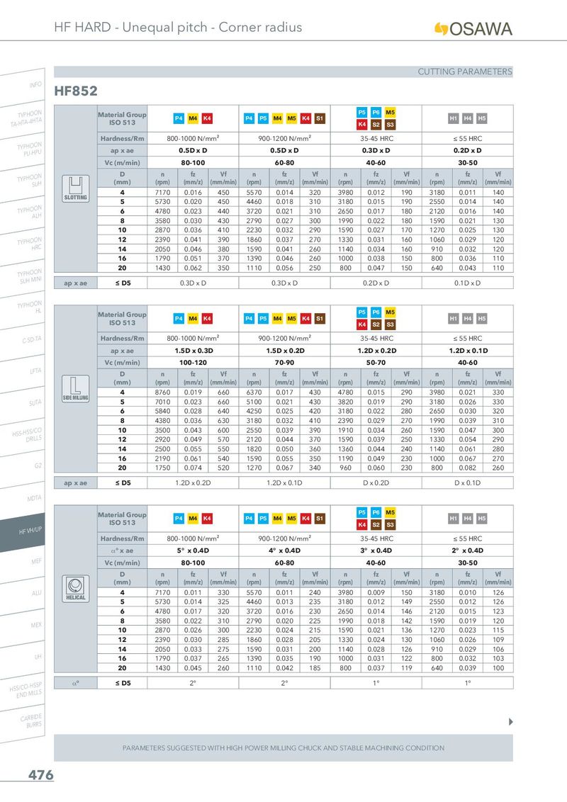 HF HARD - Unequal pitch - Corner radius CUTTING PARAMETERS INFO HF852 TA-THYTPAH-4OHOTNA Material Group P5 P6 M5 ISO 513 P4 M4 K4 P4 P5 M4 M5 K4 S1 H1 H4 H5 K4 S2 S3 Hardness/Rm 800-1000 N/mm² 900-1200 N/mm² 35-45 HRC ≤ 55 HRC TYPPHUO-HOPNU ap x ae 0.5D x D 0.5D x D 0.3D x D 0.2D x D Vc (m/min) 80-100 60-80 40-60 30-50 TYPHOSOUNH D n fz Vf n fz Vf n fz Vf n fz Vf (mm) (rpm) (mm/z) (mm/min) (rpm) (mm/z) (mm/min) (rpm) (mm/z) (mm/min) (rpm) (mm/z) (mm/min) SLOTTING 4 7170 0.016 450 5570 0.014 320 3980 0.012 190 3180 0.011 140 5 5730 0.020 450 4460 0.018 310 3180 0.015 190 2550 0.014 140 TYPHOAOLNH 6 4780 0.023 440 3720 0.021 310 2650 0.017 180 2120 0.016 140 8 3580 0.030 430 2790 0.027 300 1990 0.022 180 1590 0.021 130 10 2870 0.036 410 2230 0.032 290 1590 0.027 170 1270 0.025 130 TYPHOHORNC 12 2390 0.041 390 1860 0.037 270 1330 0.031 160 1060 0.029 120 14 2050 0.046 380 1590 0.041 260 1140 0.034 160 910 0.032 120 16 1790 0.051 370 1390 0.046 260 1000 0.038 150 800 0.036 110 TSYUPHHOMOINNI 20 1430 0.062 350 1110 0.056 250 800 0.047 150 640 0.043 110 ap x ae ≤ D5 0.3D x D 0.3D x D 0.2D x D 0.1D x D TYPHOOHNL Material Group P5 P6 M5 ISO 513 P4 M4 K4 P4 P5 M4 M5 K4 S1 H1 H4 H5 K4 S2 S3 C-SD-TA Hardness/Rm 800-1000 N/mm² 900-1200 N/mm² 35-45 HRC ≤ 55 HRC ap x ae 1.5D x 0.3D 1.5D x 0.2D 1.2D x 0.2D 1.2D x 0.1D Vc (m/min) 100-120 70-90 50-70 40-60 LFTA D n fz Vf n fz Vf n fz Vf n fz Vf (mm) (rpm) (mm/z) (mm/min) (rpm) (mm/z) (mm/min) (rpm) (mm/z) (mm/min) (rpm) (mm/z) (mm/min) SIDE MILLING 4 8760 0.019 660 6370 0.017 430 4780 0.015 290 3980 0.021 330 SUTA 5 7010 0.023 660 5100 0.021 430 3820 0.019 290 3180 0.026 330 6 5840 0.028 640 4250 0.025 420 3180 0.022 280 2650 0.030 320 8 4380 0.036 630 3180 0.032 410 2390 0.029 270 1990 0.039 310 HSS-HDSSR/ILCLOS 10 3500 0.043 600 2550 0.039 390 1910 0.034 260 1590 0.047 300 12 2920 0.049 570 2120 0.044 370 1590 0.039 250 1330 0.054 290 14 2500 0.055 550 1820 0.050 360 1360 0.044 240 1140 0.061 280 16 2190 0.061 540 1590 0.055 350 1190 0.049 230 1000 0.067 270 G2 20 1750 0.074 520 1270 0.067 340 960 0.060 230 800 0.082 260 ap x ae ≤ D5 1.2D x 0.2D 1.2D x 0.1D D x 0.2D D x 0.1D MDTA Material Group P5 P6 M5 ISO 513 P4 M4 K4 P4 P5 M4 M5 K4 S1 H1 H4 H5 HF VH/UP K4 S2 S3 Hardness/Rm 800-1000 N/mm² 900-1200 N/mm² 35-45 HRC ≤ 55 HRC _° x ae 5° x 0.4D 4° x 0.4D 3° x 0.4D 2° x 0.4D MEF Vc (m/min) 80-100 60-80 40-60 30-50 D n fz Vf n fz Vf n fz Vf n fz Vf (mm) (rpm) (mm/z) (mm/min) (rpm) (mm/z) (mm/min) (rpm) (mm/z) (mm/min) (rpm) (mm/z) (mm/min) ALU HELICAL 4 7170 0.011 330 5570 0.011 240 3980 0.009 150 3180 0.010 126 5 5730 0.014 325 4460 0.013 235 3180 0.012 149 2550 0.012 126 6 4780 0.017 320 3720 0.016 230 2650 0.014 146 2120 0.015 123 MEX 8 3580 0.022 310 2790 0.020 225 1990 0.018 142 1590 0.019 120 10 2870 0.026 300 2230 0.024 215 1590 0.021 136 1270 0.023 115 12 2390 0.030 285 1860 0.028 205 1330 0.024 130 1060 0.026 109 14 2050 0.033 275 1590 0.031 200 1140 0.028 126 910 0.029 106 UH 16 1790 0.037 265 1390 0.035 190 1000 0.031 122 800 0.032 103 20 1430 0.045 260 1110 0.042 185 800 0.037 119 640 0.039 100 HSSE/NCDO-MHISLSLPS _° ≤ D5 2° 2° 1° 1° CARBIDE BURRS PARAMETERS SUGGESTED WITH HIGH POWER MILLING CHUCK AND STABLE MACHINING CONDITION 476