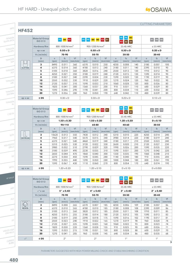 HF HARD - Unequal pitch - Corner radius CUTTING PARAMETERS INFO HF452 TA-THYTPAH-4OHOTNA Material Group P5 P6 M5 ISO 513 P4 M4 K4 P4 P5 M4 M5 K4 S1 H1 H4 H5 K4 S2 S3 Hardness/Rm 800-1000 N/mm² 900-1200 N/mm² 35-45 HRC ≤ 55 HRC TYPPHUO-HOPNU ap x ae 0.5D x D 0.5D x D 0.3D x D 0.2D x D Vc (m/min) 70-90 50-70 30-50 20-40 TYPHOSOUNH D n fz Vf n fz Vf n fz Vf n fz Vf (mm) (rpm) (mm/z) (mm/min) (rpm) (mm/z) (mm/min) (rpm) (mm/z) (mm/min) (rpm) (mm/z) (mm/min) 3 8490 0.011 360 6370 0.010 250 4250 0.008 140 3180 0.007 100 SLOTTING 4 6370 0.014 360 4780 0.013 240 3180 0.011 140 2390 0.010 90 TYPHOAOLNH 5 5100 0.018 360 3820 0.016 240 2550 0.013 130 1910 0.012 90 6 4250 0.021 350 3180 0.019 240 2120 0.015 130 1590 0.014 90 8 3180 0.027 340 2390 0.024 230 1590 0.020 130 1190 0.019 90 TYPHOHORNC 10 2550 0.032 330 1910 0.029 220 1270 0.024 120 960 0.022 90 12 2120 0.037 310 1590 0.033 210 1060 0.028 120 800 0.026 80 14 1820 0.041 300 1360 0.037 200 910 0.031 110 680 0.029 80 TSYUPHHOMOINNI 16 1590 0.046 290 1190 0.041 200 800 0.034 110 600 0.032 80 20 1270 0.056 280 960 0.050 190 640 0.042 110 480 0.039 80 ap x ae ≤ D5 0.3D x D 0.3D x D 0.2D x D 0.1D x D TYPHOOHNL Material Group P5 P6 M5 ISO 513 P4 M4 K4 P4 P5 M4 M5 K4 S1 H1 H4 H5 C-SD-TA K4 S2 S3 Hardness/Rm 800-1000 N/mm² 900-1200 N/mm² 35-45 HRC ≤ 55 HRC ap x ae 1.5D x 0.3D 1.5D x 0.2D 1.2D x 0.2D D x 0.1D LFTA Vc (m/min) 90-110 60-80 40-60 30-50 D n fz Vf n fz Vf n fz Vf n fz Vf (mm) (rpm) (mm/z) (mm/min) (rpm) (mm/z) (mm/min) (rpm) (mm/z) (mm/min) (rpm) (mm/z) (mm/min) SUTA 3 10620 0.013 550 7430 0.012 340 5310 0.010 220 4250 0.014 240 SIDE MILLING 4 7960 0.017 540 5570 0.015 340 3980 0.014 220 3180 0.019 240 5 6370 0.021 540 4460 0.019 340 3180 0.017 210 2550 0.023 240 HSS-HDSSR/ILCLOS 6 5310 0.025 530 3720 0.022 330 2650 0.020 210 2120 0.027 230 8 3980 0.032 510 2790 0.029 320 1990 0.026 200 1590 0.035 220 10 3180 0.039 490 2230 0.035 310 1590 0.031 200 1270 0.042 220 12 2650 0.044 470 1860 0.040 300 1330 0.035 190 1060 0.048 210 G2 14 2270 0.050 450 1590 0.045 280 1140 0.040 180 910 0.055 200 16 1990 0.055 440 1390 0.050 280 1000 0.044 180 800 0.061 190 20 1590 0.067 430 1110 0.060 270 800 0.054 170 640 0.074 190 MDTA ap x ae ≤ D5 1.2D x 0.2D 1.2D x 0.1D D x 0.1D D x 0.05D HF VH/UP Material Group P5 P6 M5 ISO 513 P4 M4 K4 P4 P5 M4 M5 K4 S1 H1 H4 H5 K4 S2 S3 MEF Hardness/Rm 800-1000 N/mm² 900-1200 N/mm² 35-45 HRC ≤ 55 HRC _° x ae 5° x 0.4D 4° x 0.4D 3° x 0.4D 2° x 0.4D Vc (m/min) 70-90 50-70 30-50 20-40 ALU D n fz Vf n fz Vf n fz Vf n fz Vf (mm) (rpm) (mm/z) (mm/min) (rpm) (mm/z) (mm/min) (rpm) (mm/z) (mm/min) (rpm) (mm/z) (mm/min) 3 8490 0.008 265 6370 0.007 185 4250 0.006 109 3180 0.007 86 MEX HELICAL 4 6370 0.010 265 4780 0.010 185 3180 0.008 108 2390 0.009 86 5 5100 0.013 260 3820 0.012 185 2550 0.011 108 1910 0.011 85 6 4250 0.015 255 3180 0.014 180 2120 0.012 105 1590 0.013 83 8 3180 0.019 250 2390 0.018 175 1590 0.016 102 1190 0.017 81 UH 10 2550 0.023 240 1910 0.022 165 1270 0.019 98 960 0.020 78 12 2120 0.027 225 1590 0.025 160 1060 0.022 93 800 0.023 74 14 1820 0.030 220 1360 0.028 155 910 0.025 90 680 0.026 71 HSSE/NCDO-MHISLSLPS 16 1590 0.033 215 1190 0.031 150 800 0.028 88 600 0.029 70 20 1270 0.041 205 960 0.038 145 640 0.034 86 480 0.035 68 CARBIDE _° ≤ D5 2° 2° 1° 1° BURRS PARAMETERS SUGGESTED WITH HIGH POWER MILLING CHUCK AND STABLE MACHINING CONDITION 480