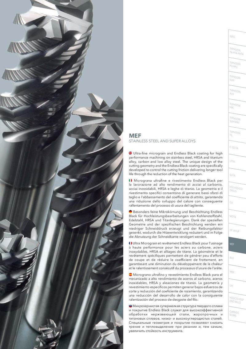 INFO TTYAP-HHTOAO-4NHTA TPYUP-HHPOUON TSUYPHHOON TAYLPHHOON THYRPCHOON TSUYPHHMOIONIN MEF THYLPHOON STAINLESS STEEL AND SUPER ALLOYS C-SD-TA Ultra-fine micrograin and Endless Black coating for high performance machining on stainless steel, HRSA and titanium alloy, carbon and low alloy steel. The unique design of the LFTA cutting geometry and the Endless Black coating are specifically developed to control the cutting friction delivering longer tool life through the reduction of the heat generation. SUTA Micrograna ultrafine e rivestimento Endless Black per la lavorazione ad alto rendimento di acciai al carbonio, HDSRSIL-LHSSS/CO acciai inossidabili, HRSA e leghe di titanio. La geometria e il rivestimento specifici consentono di generare bassi sforzi di taglio e l'abbassamento del coefficiente di attrito, garantendo una riduzione dello sviluppo del calore con conseguente G2 rallentamento del processo di usura del tagliente. Besonders feine Mikrokörnung und Beschichtung Endless Black für Hochleistungsbearbeitungen von Kohlenstoffstahl, MDTA Edelstahl, HRSA und Titanlegierungen. Dank der speziellen Geometrie und der spezifischen Beschichtung werden ein niedriger Schneiddruck erzeugt und der Reibungsfaktor HF VH/UP gesenkt, wodurch die Hitzeentwicklung reduziert und in Folge die Abnutzung der Schneidkante verzögert werden. Ultra Micrograin et revêtement Endless Black pour l’usinage MEF à haute performance pour les aciers au carbone, aciers inoxydables, HRSA et alliages de titane. La géométrie et le revêtement spécifiques permettent de générer peu d’efforts ALU de coupe et de réduire le coefficient de frottement, en garantissant une diminution du développement de la chaleur et le ralentissement consécutif du processus d’usure de l’arête. Micrograno ultrafino y revestimiento Endless Black para el MEX mecanizado a alto rendimiento de aceros al carbono, aceros inoxidables, HRSA y aleaciones de titanio. La geometría y UH revestimiento específicos permiten generar bajos esfuerzos de corte y reducción del coeficiente de rozamiento, garantizando una reducción del desarrollo de calor con la consiguiente HENSSD/CMOIL-LHSSSP ralentización del proceso de desgaste del filo. Микрозернистая супермелкая структура твердого сплава и покрытие Endless Black служат для высокоэффективной CBUARRRBSIDE обработки нержавеющей стали, жаропрочных и титановых сплавов, низко- и высокоуглеродистых сталей. Специальные геометрия и покрытие позволяют снизить трение и тепловыделение при резании и, тем самым, увеличить стойкость инструмента.