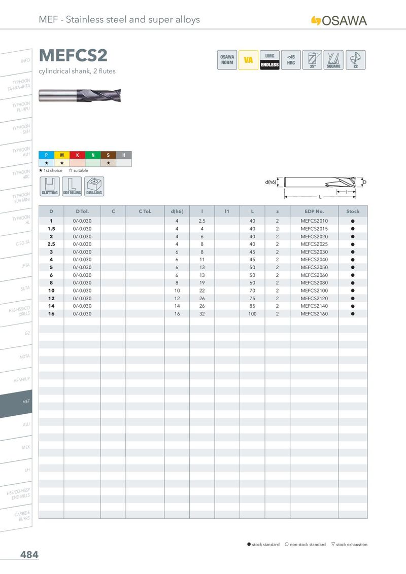MEF - Stainless steel and super alloys INFO MEFCS2 OSAWA <45 NORM HRC cylindrical shank, 2 flutes TA-THYTPAH-4OHOTNA TYPPHUO-HOPNU TYPHOSOUNH TYPHOAOLNH P M K N S H + + + TYPHOHORNC + 1st choice , suitable TSYUPHHOMOINNI SLOTTING SIDE MILLING DRILLING D D Tol. C C Tol. d(h6) l l1 L z EDP No. Stock TYPHOOHNL 1 0/-0.030 4 2.5 40 2 MEFCS2010 h 1.5 0/-0.030 4 4 40 2 MEFCS2015 h 2 0/-0.030 4 6 40 2 MEFCS2020 h C-SD-TA 2.5 0/-0.030 4 8 40 2 MEFCS2025 h 3 0/-0.030 6 8 45 2 MEFCS2030 h 4 0/-0.030 6 11 45 2 MEFCS2040 h LFTA 5 0/-0.030 6 13 50 2 MEFCS2050 h 6 0/-0.030 6 13 50 2 MEFCS2060 h 8 0/-0.030 8 19 60 2 MEFCS2080 h SUTA 10 0/-0.030 10 22 70 2 MEFCS2100 h 12 0/-0.030 12 26 75 2 MEFCS2120 h HSS-HDSSR/ILCLOS 14 0/-0.030 14 26 85 2 MEFCS2140 h 16 0/-0.030 16 32 100 2 MEFCS2160 h G2 MDTA HF VH/UP MEF ALU MEX UH HSSE/NCDO-MHISLSLPS CARBIDE BURRS h stock standard f non-stock standard m stock exhaustion 484