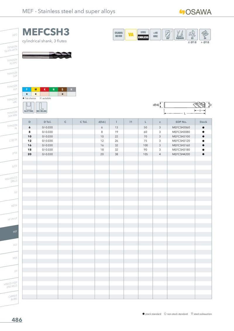 MEF - Stainless steel and super alloys INFO MEFCSH3 OSAWA <45 NORM HRC cylindrical shank, 3 flutes ≤ Ø18 > Ø18 TA-THYTPAH-4OHOTNA TYPPHUO-HOPNU TYPHOSOUNH TYPHOAOLNH P M K N S H + + + TYPHOHORNC + 1st choice , suitable TSYUPHHOMOINNI SLOTTING SIDE MILLING D D Tol. C C Tol. d(h6) l l1 L z EDP No. Stock TYPHOOHNL 6 0/-0.030 6 13 50 3 MEFCSH3060 h 8 0/-0.030 8 19 60 3 MEFCSH3080 h 10 0/-0.030 10 22 70 3 MEFCSH3100 h C-SD-TA 12 0/-0.030 12 26 75 3 MEFCSH3120 h 16 0/-0.030 16 32 100 3 MEFCSH3160 h 18 0/-0.030 18 32 90 3 MEFCSH3180 h LFTA 20 0/-0.030 20 38 105 4 MEFCSH4200 h SUTA HSS-HDSSR/ILCLOS G2 MDTA HF VH/UP MEF ALU MEX UH HSSE/NCDO-MHISLSLPS CARBIDE BURRS h stock standard f non-stock standard m stock exhaustion 486